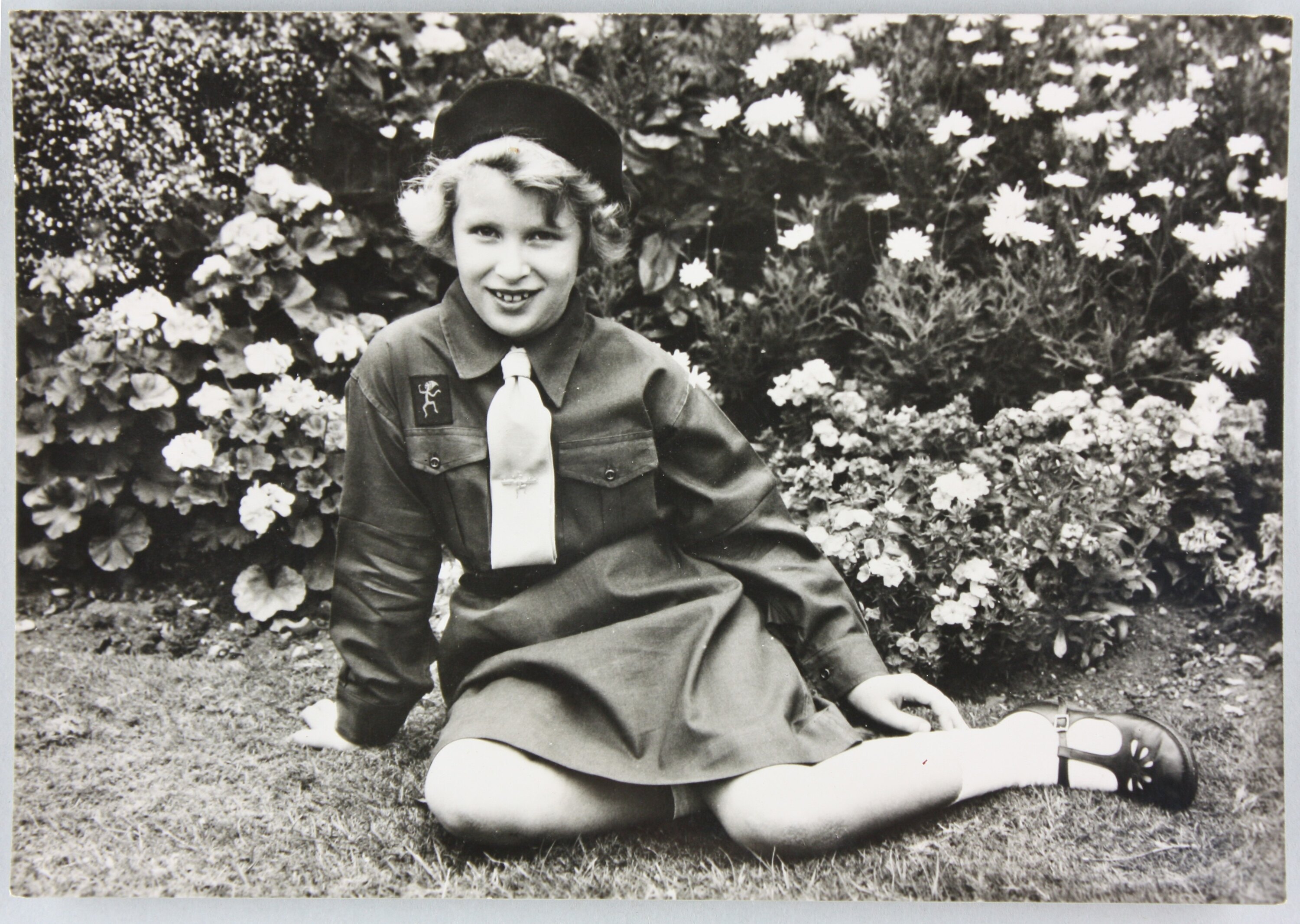 Reverse:' HRH the Princess Anne in the Gardens of Buckingham Palace shortly after her enrolment as a Brownie/ Photograph: Studio Lisa/ The Girl Guides Association, 17-19 Buckingham Palace Road, London'