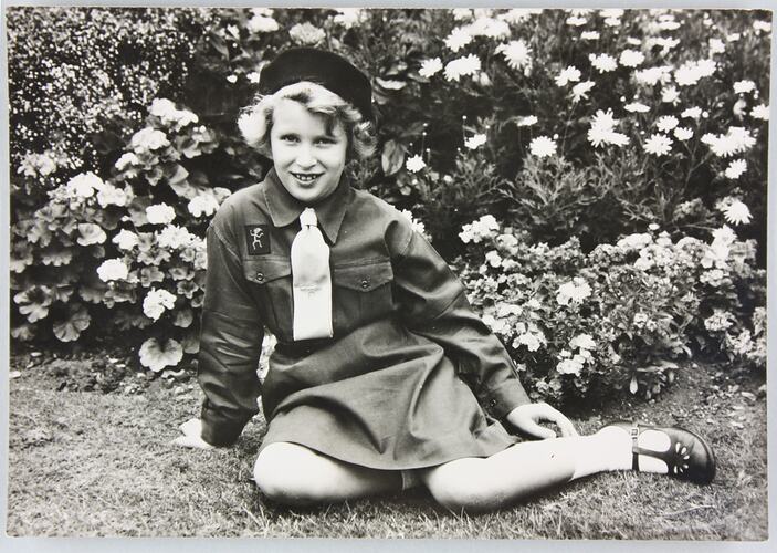 Black and white postcard featuring image of a young Princess Anne of England in a Brownie uniform in the gardens of Buckingham Palace. Lucy Hathaway had been a company leader for the Ringwood Girl Guides in England before migrating to Australia with her husband Stan and daughters in 1951. It was kept by Lucy as a memento, demonstrating her continued interest in both the Royal Family and in Girl Guiding once in Australia.