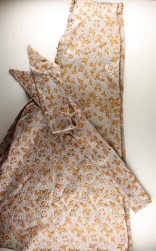 Gold and silver threaded lame flared trousers, made and worn by Dorothea Dunzinger [formerly Huber and nee Freitag] after she migrated from Austria to Melbourne in 1959.