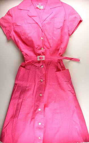 Short sleeved cotton dress, pink with stippled texture.The dress has a collar, 2 breast pockets, 2 skirt pockets and 9 pearl buttons down the full front length. There a two cotton belt hoops at each hip and a separate belt with pearl plastic buckle and a small fixing hook. There is a manufaturer's label at the inside neck.