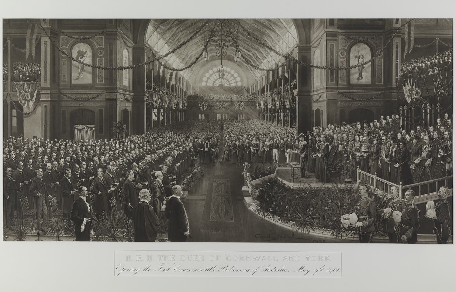 Titled, dated and signed, bottom centre of composition:'Charles Nuttall 1902' Text: H.R.H. THE DUKE OF CORNWALL AND YORK / Opening of the First Commonwealth of Parliament of Australia. May 9th 1901.