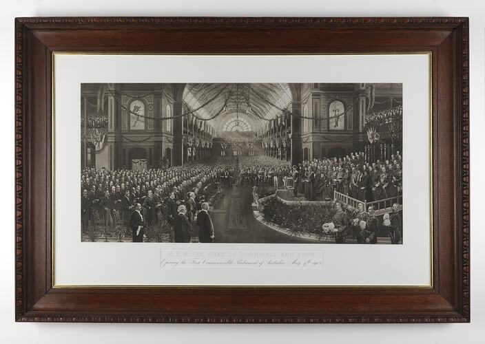 Large photogravure in black and white, depicting the opening of the first Federal Parliament in the Exhibition Buildings, Melbourne, on 9 May 1901. The image shows the interior of the Great Hall, with the assembled crowd during the ceremony. On the official dais are the Duke and Duchess of Cornwall and York and the Governor General, the Earl of Hopetoun and the Countess of Hopetoun. Facing the dais are the members of the first Commonwealth Parliament. The photogravure is mounted in a glazed, carved oak frame. There is a gold border around the interior border of the frame, beneath the glass. A window has been cut in the mount to reveal the title text.