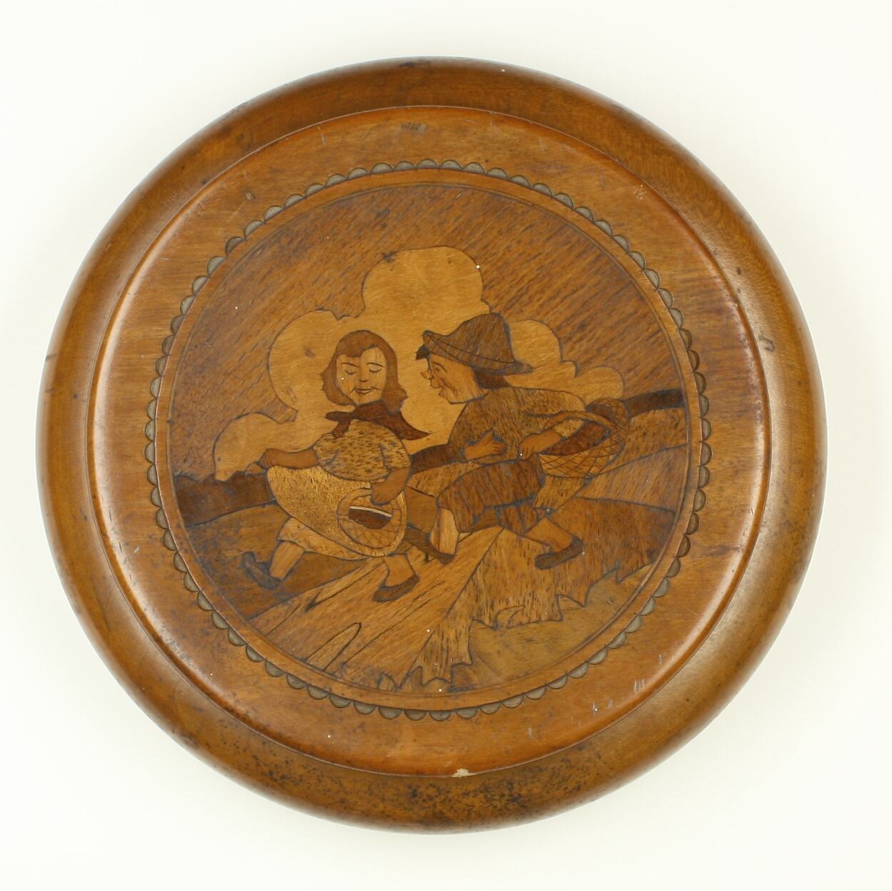 Circular carved wooden box with inlaid lid featuring image of a young boy and young girl walking in the countryside. Lid sits in carved base which has engraving on the reverse.