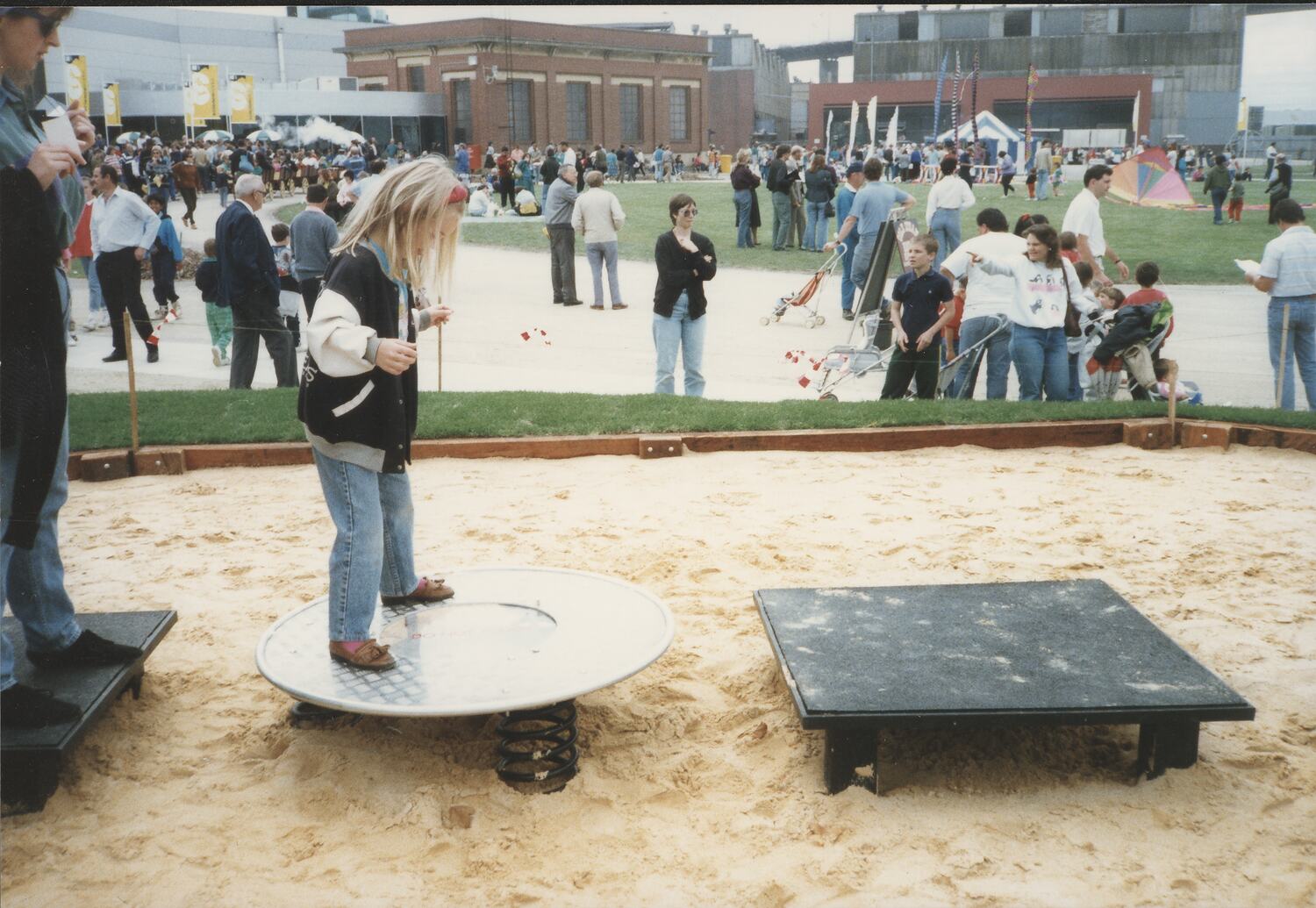 A young girl standing on a platform in a playground at the Scienceworks opening ceremony.