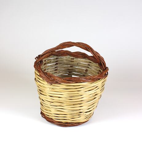 Medium sized woven basket with handle. The body of the basket is woven from single pieces of split light yellow cane. The base of the basket is constructed from a radial pattern of single strand red cane. The border and handle of the basket is woven from a twisted plait of multiple red canes.