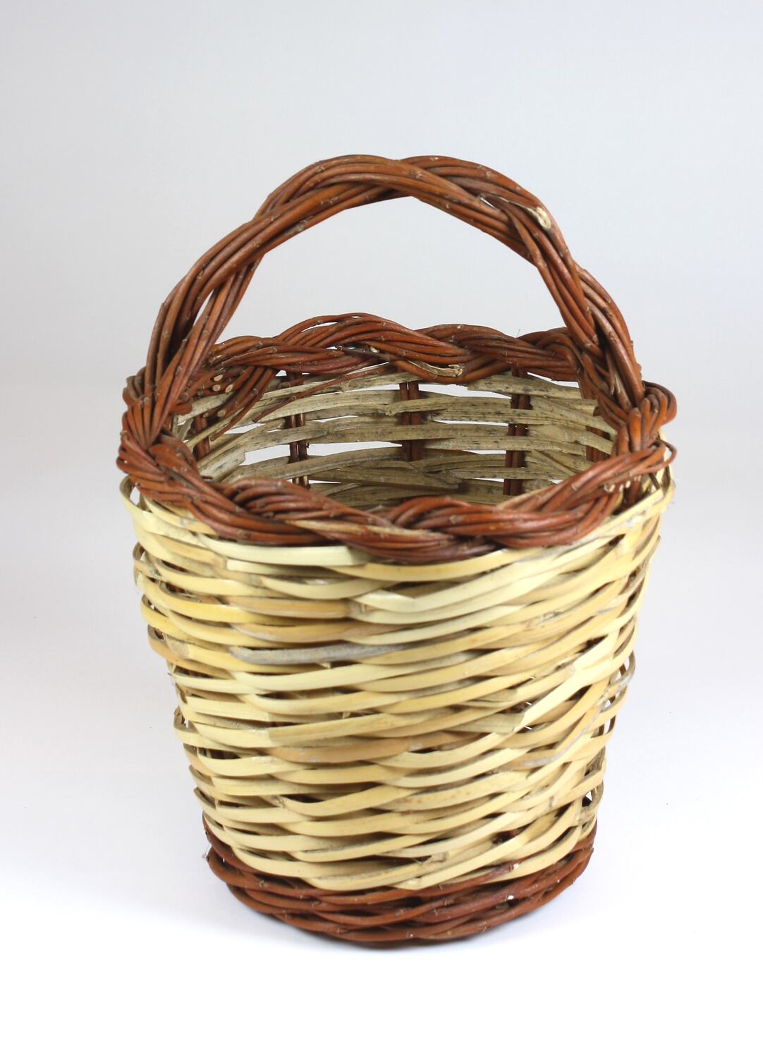 Medium sized, tall and narrow woven basket with handle. The body of the basket is woven from single pieces of split light yellow cane. The base of the basket is constructed from a radial pattern of single strand red cane. The border and handle of the basket is woven from a twisted plait of multiple red canes.