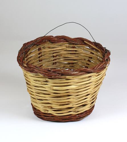 Small woven basket with handle. The body of the basket is woven from single pieces of split light yellow cane. The base of the basket is constructed from a radial pattern of single strand red cane. The border of the basket is woven from a twisted plait of multiple red canes. The handle is made from a thin strand of wire, woven and twisted at the left and right sides of the red cane border.