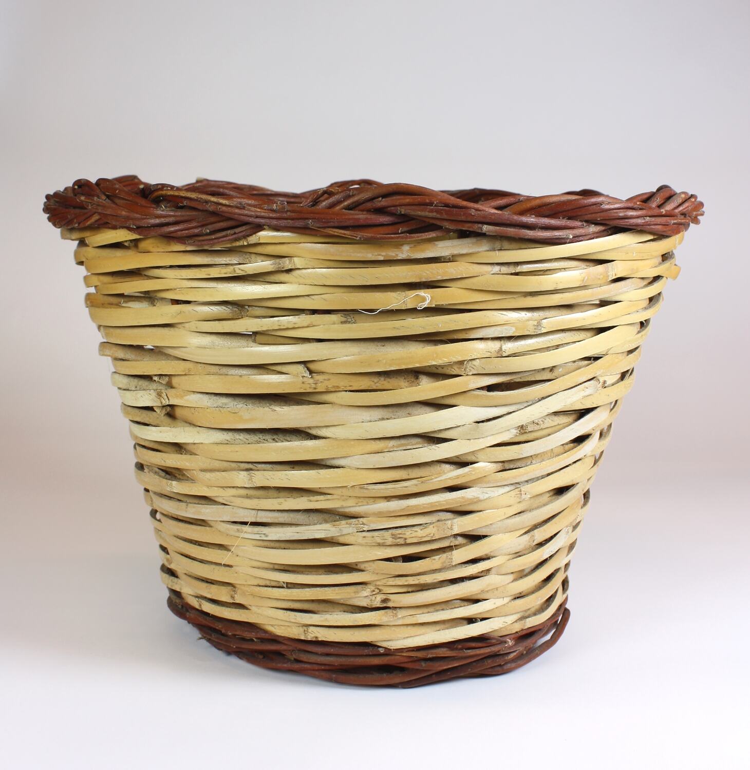 Traditional Sicilian basket hand made by Salvatore Mazzarino from two types of woven cane. The basket was used for collecting vegetables, and storing potatoes and onions and the cane he grew, harvested and prepared from his own garden in St Albans.