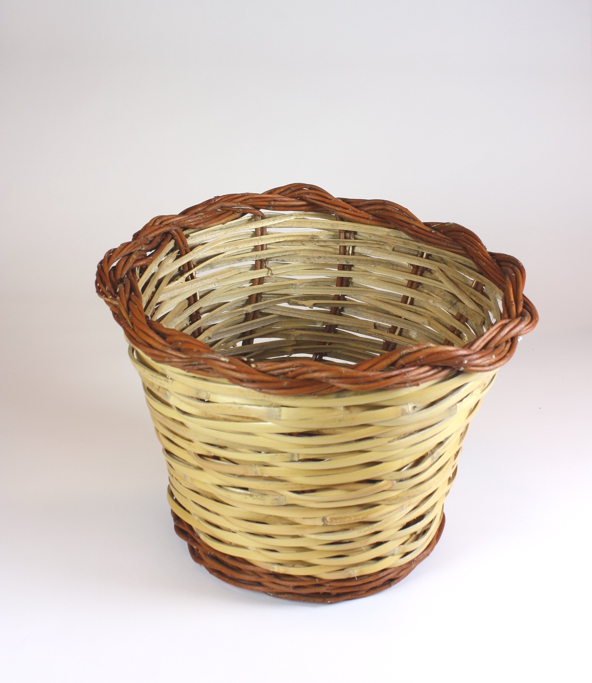 Medium sized woven basket without handle, with a slightly dropped front. The body of the basket is woven from single pieces of split light yellow cane. The base of the basket is constructed from a radial pattern of single strand red cane. The border of the basket is woven from a twisted plait of multiple red canes.