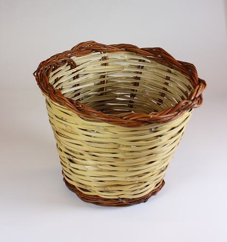 Medium sized woven basket without handle, with a slightly dropped front. The body of the basket is woven from single pieces of split light yellow cane. The base of the basket is constructed from a radial pattern of single strand red cane. The border of the basket is woven from a twisted plait of multiple red canes.