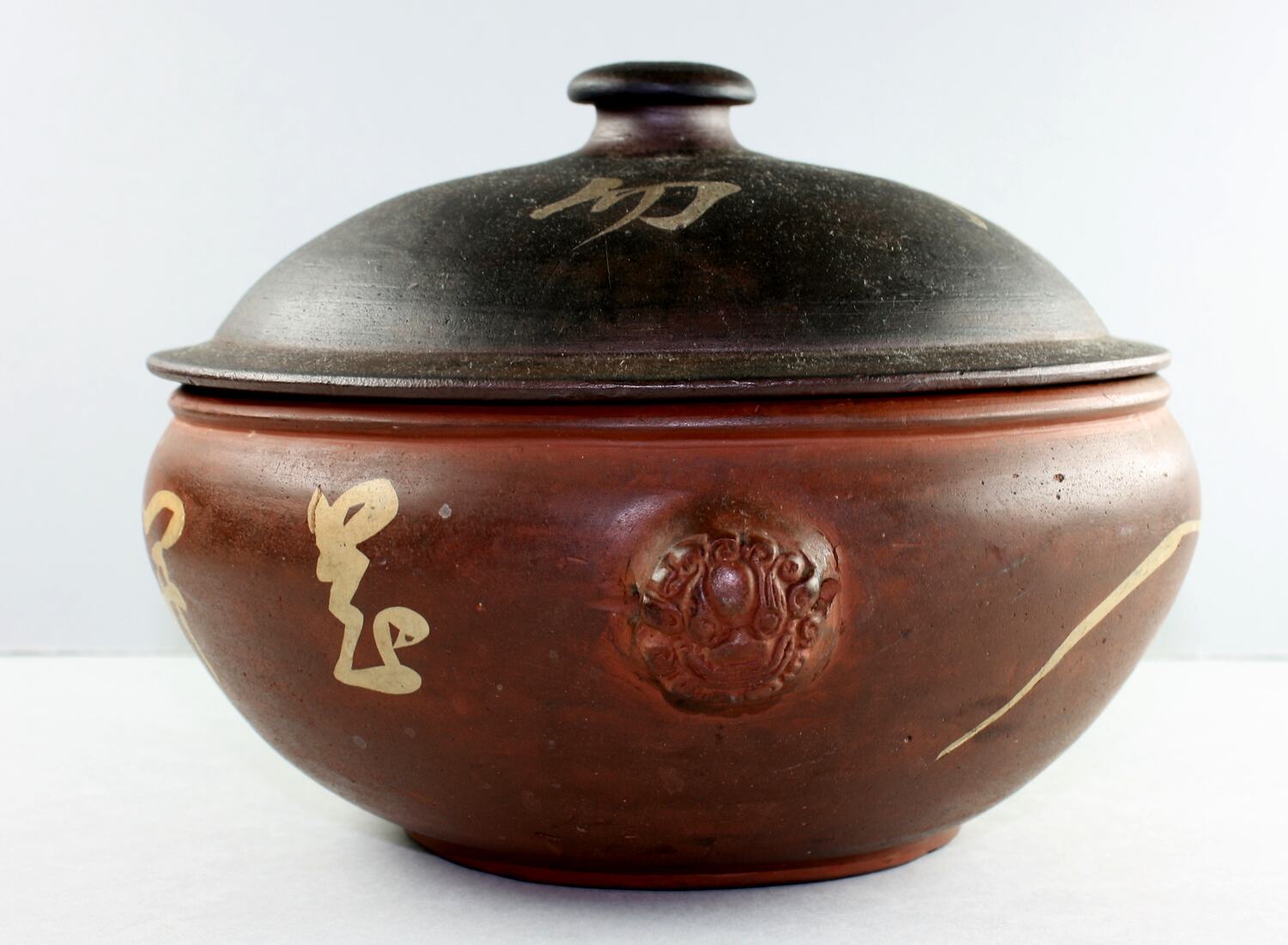 Brown clay pot with lid and pot. Stone has been inlaid in Chinese letters around the lid and in a pattern around the pot.