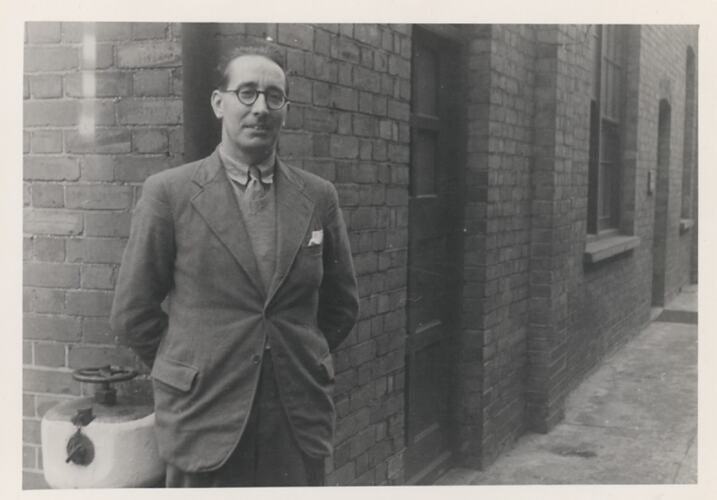 Man standing in a laneway at the corner of a brick building. The man is wearing a coat over a shirt, vest and tie. He wears glasses, and has his hands behind his back. At his left is an outlet with valve and turning wheel, mounted on the wall. Doors and windows are on the side of the building to his right.