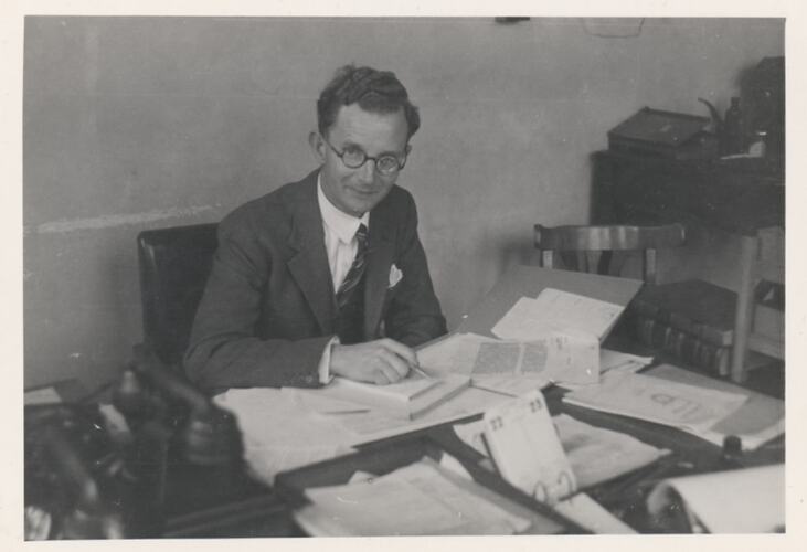 Man sitting at a desk, with a folder of papers and pen and notepad in front of him. A telephone, desk calendar, documents and filing tray are in the foreground. A spare chair and shelving is at right. The man is wearing a coat over a shirt, vest and tie, and he also wears glasses.