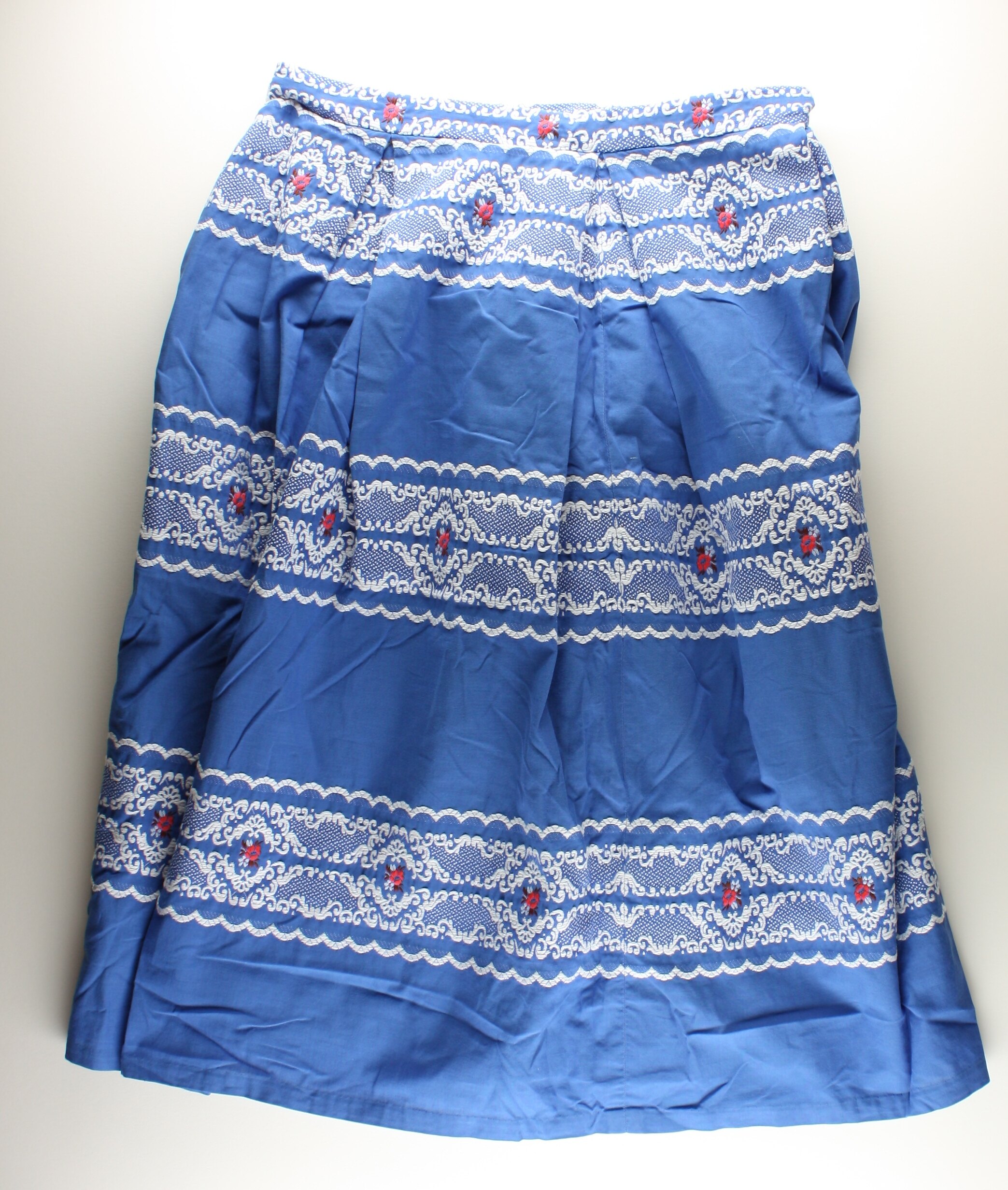 Blue cotton embroidered skirt brought by Dorothea Dunzinger [formerly Huber and nee Freitag] when she migrated from Austria to Melbourne in 1959.