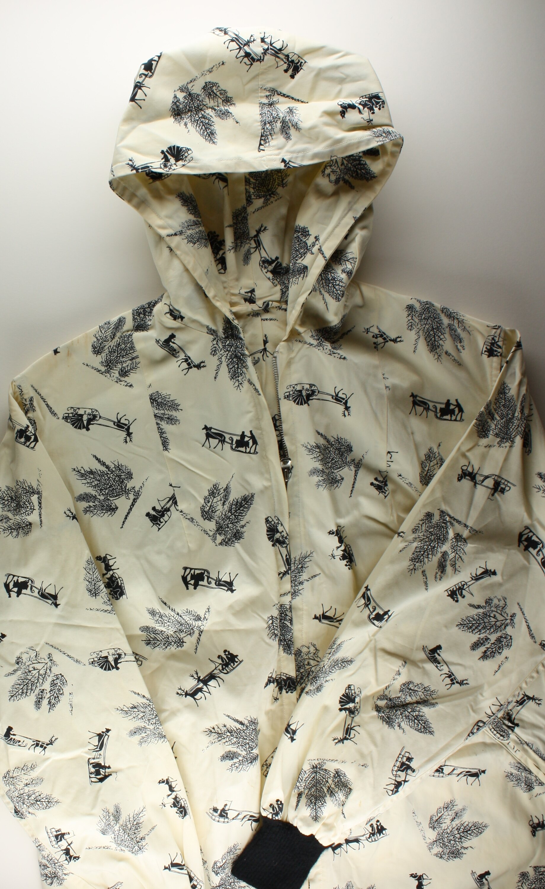 Brushed cream cotton & black printed ski jacket made by Dorothea Dunzinger [formerly Huber and nee Freitag] and brought with her when she migrated from Austria to Melbourne in 1959. Dorothea used the jacket when skiing in Europe and it relates to her set of skis and ski poles, ruck sack and scarves which she also brought with her, but never used in Australia.