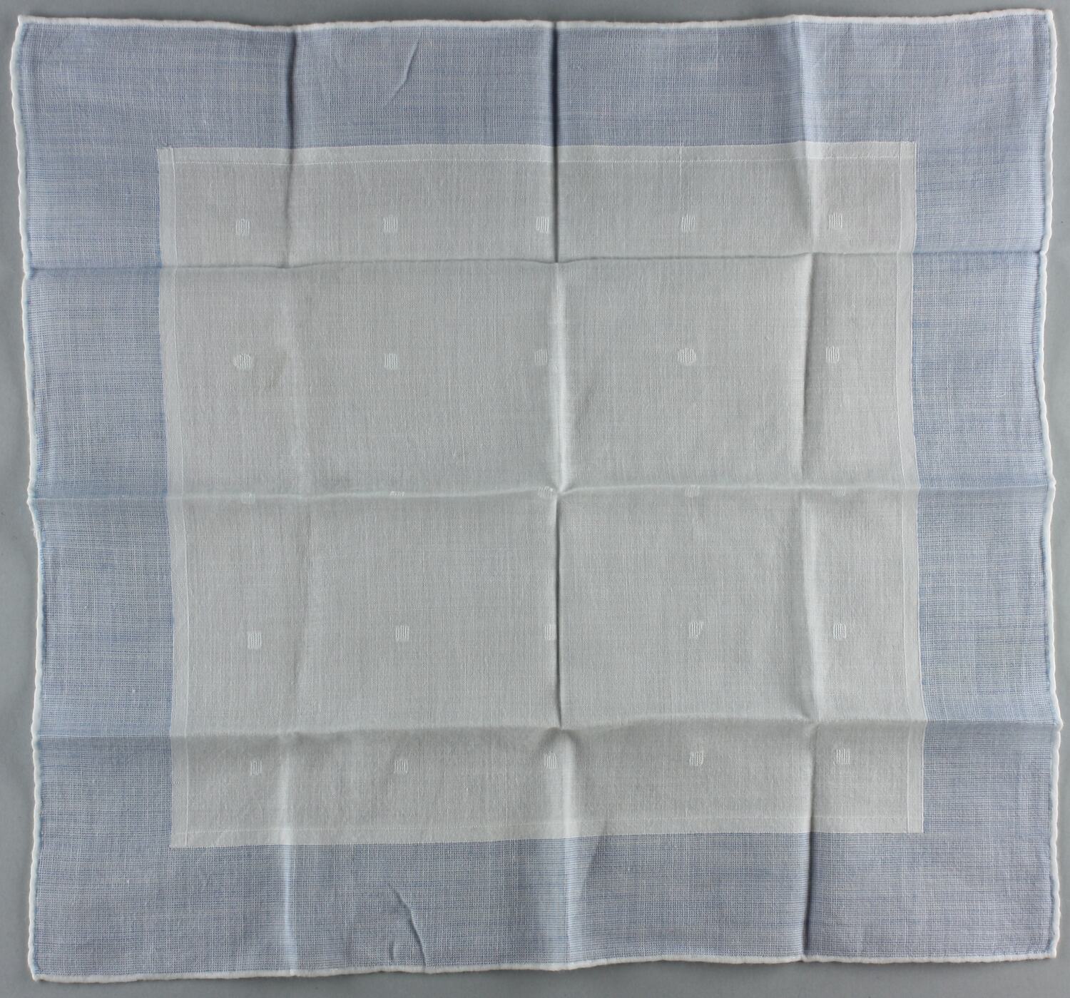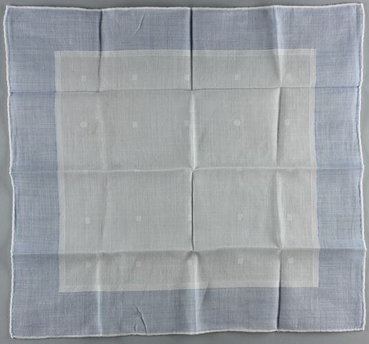 Fine hand-woven handkerchief white with blue edging and white embroidered dots. It was amongst the personal possessions brought to Australia by Dorothea Dunzinger [formerly Huber and nee Freitag] when she migrated from Austria to Melbourne in 1959. Dorothea was an accomplished seamstress, embroider and weaver.