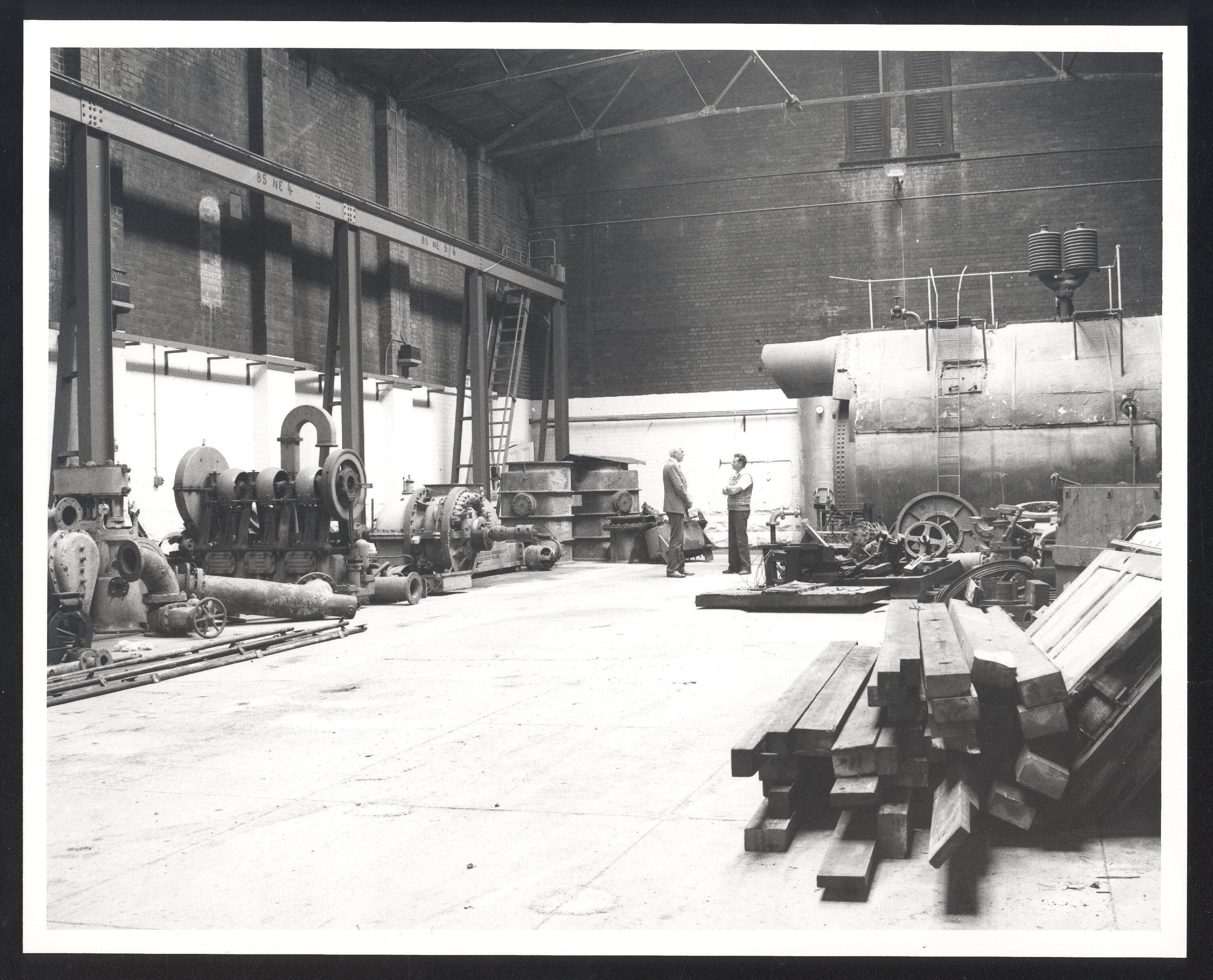 Curator of Engineering Bill Sidebottom talking to assistant curator Chris Dixon in the north Boiler room of the Spotswood Pumping Station. At this time some collection objects were stored in the Boiler room. The large cylindrical object seen in profile at the rear right hand side is the Thompson steam boiler No.4 which was part of the original Pumping Station equipment. The equipment at the left are parts of the Brush Electrical Engineering Co steam turbine.