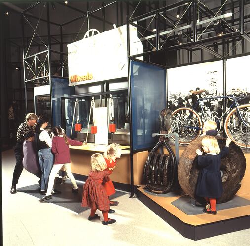 Children using interactive displays relating to wheels in the Inventions exhibition at Scienceworks.
