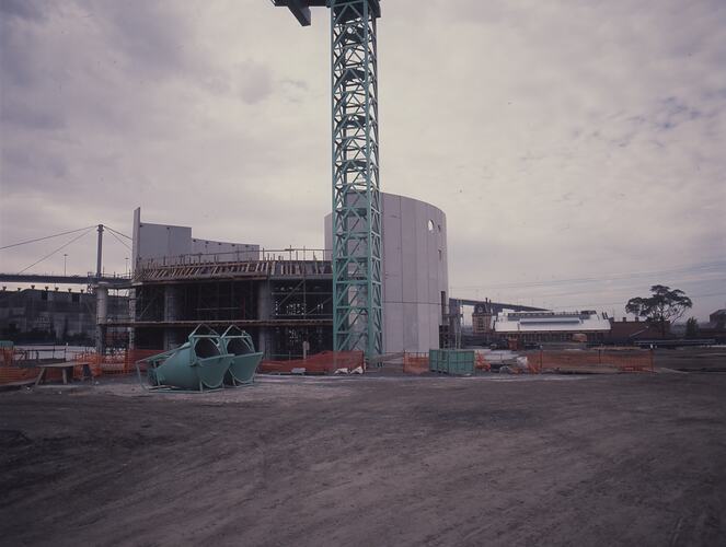 Exterior view of the Scienceworks building under construction. This is the offfice block known as 'the drum'. This part of the building was supposed to be inspired by the large bulk oil storage tanks on sites surrounding Scienceworks.