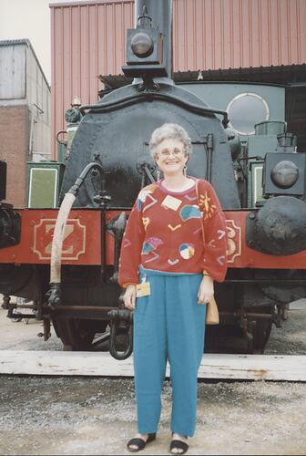 Museum staff member, Ruth Leveson, standing in front of the 'Polly' Z-class steam locomotive at the Scienceworks opening weekend. The locomotive was 99 years old at this time and was the first object installed in the Garage.