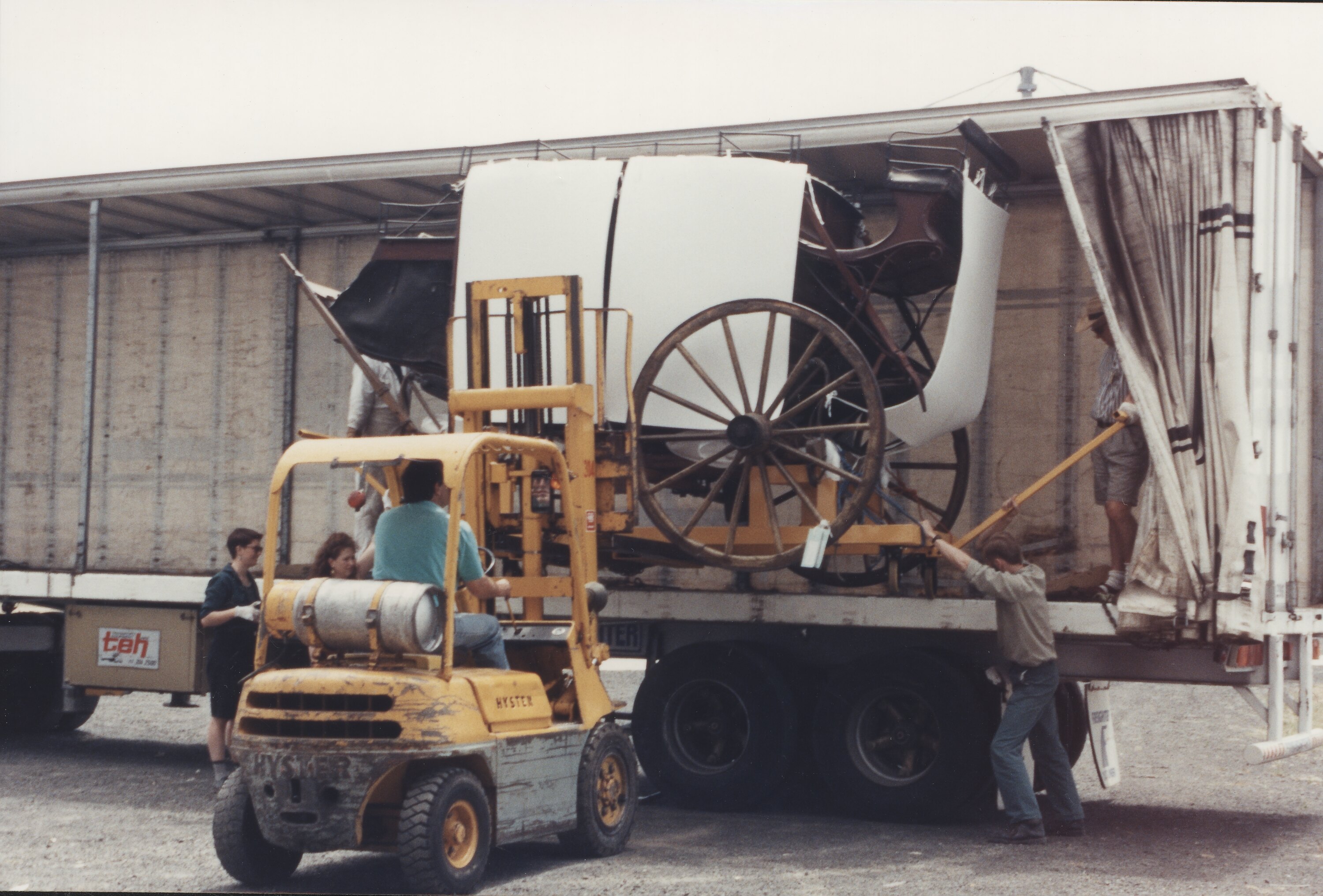 Removing the Abbott & Downing 'Concord' Coach from a truck during an object relocation to Scienceworks. Staff at left of forklift are Fiona Lawry and Kathryn Kiely of the Relocation team. At right of forklift, Neville Quick. On truck, Mark Hill.