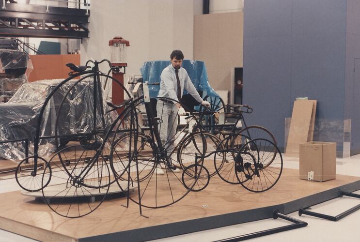 Museum staff member, Richard Glover, installing a bicycle display at Scienceworks. Cycles from left to right: H. Bassett & Co, John James, Dux Cycle Co. a Bates, and a tricycle. Supported by Richard's right hand is the Bates drop frame bicycle and by his left hand, the Dux Cycle Co bicycle. Behind under wraps is the Austin Seven motor car and Brougham horsedrawn carriage.