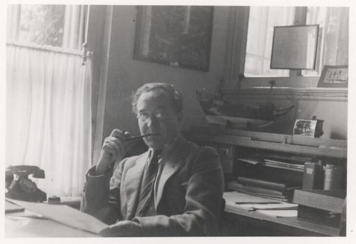 Man sitting at desk looking at camera, and smoking a pipe. A telephone is at left, and there is another desk behind him with documents, books and stationery on it. Framed images are hung on the walls and on the window behind him. There is another window at left with a lace curtain.