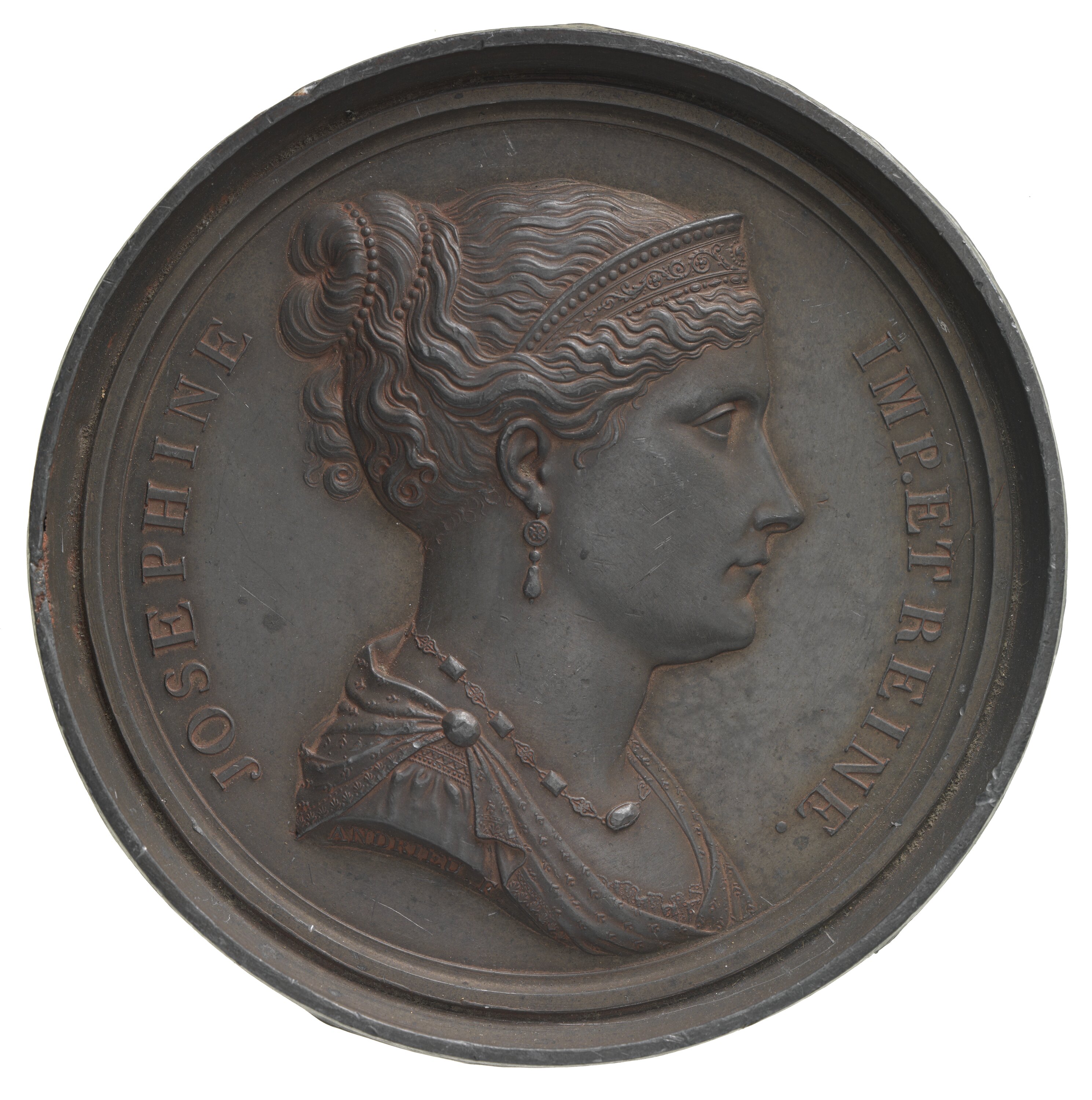 Round medal. Bust of Josephine right, diademed and robed, wearing earring, necklace and her hair bound with pearls. The reverse is blank and scratched.