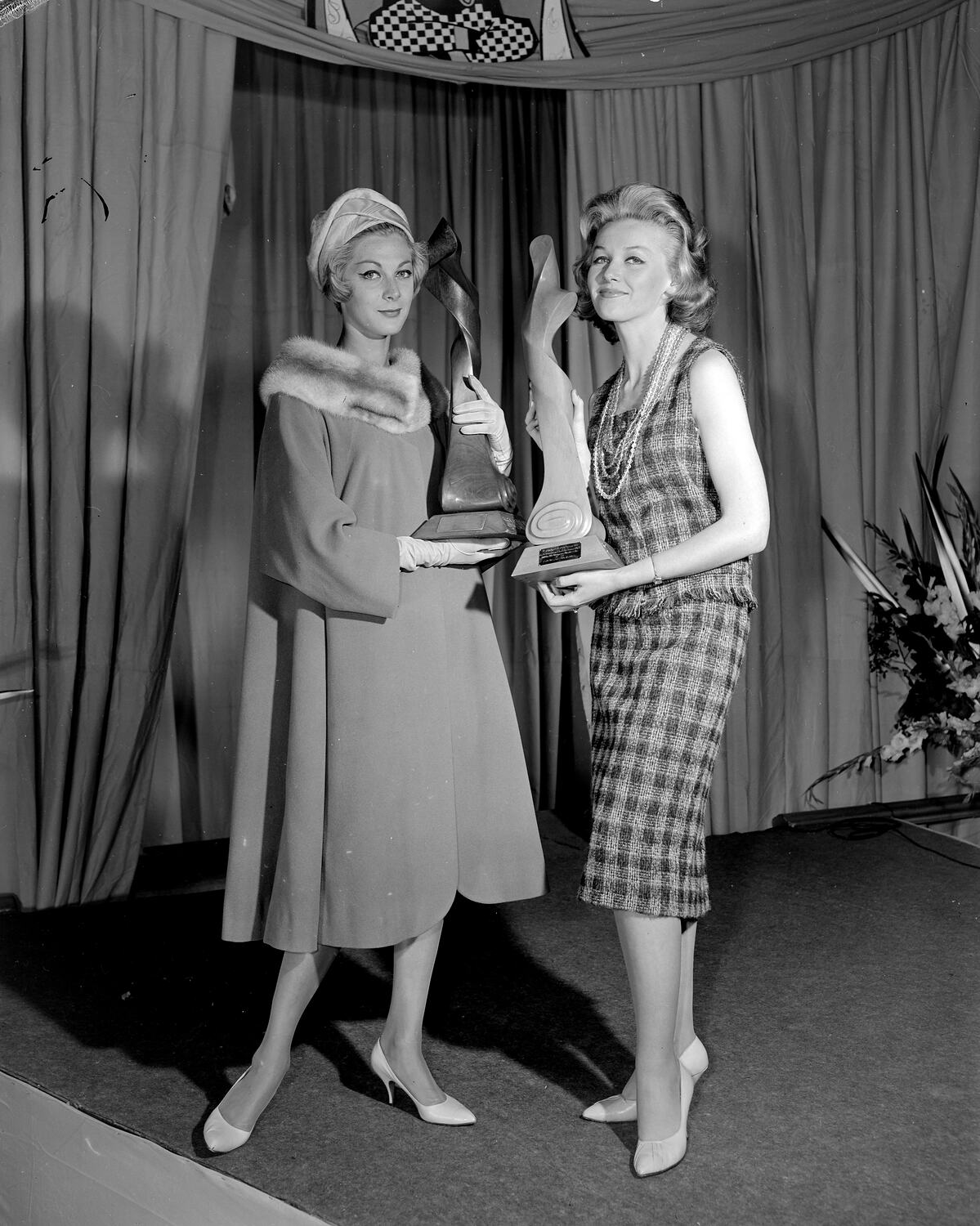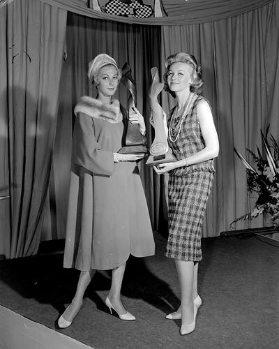 Promotional photograph of two women holding trophies awarded by the Australian Wool Board at the Palais Theatre, St Kilda.