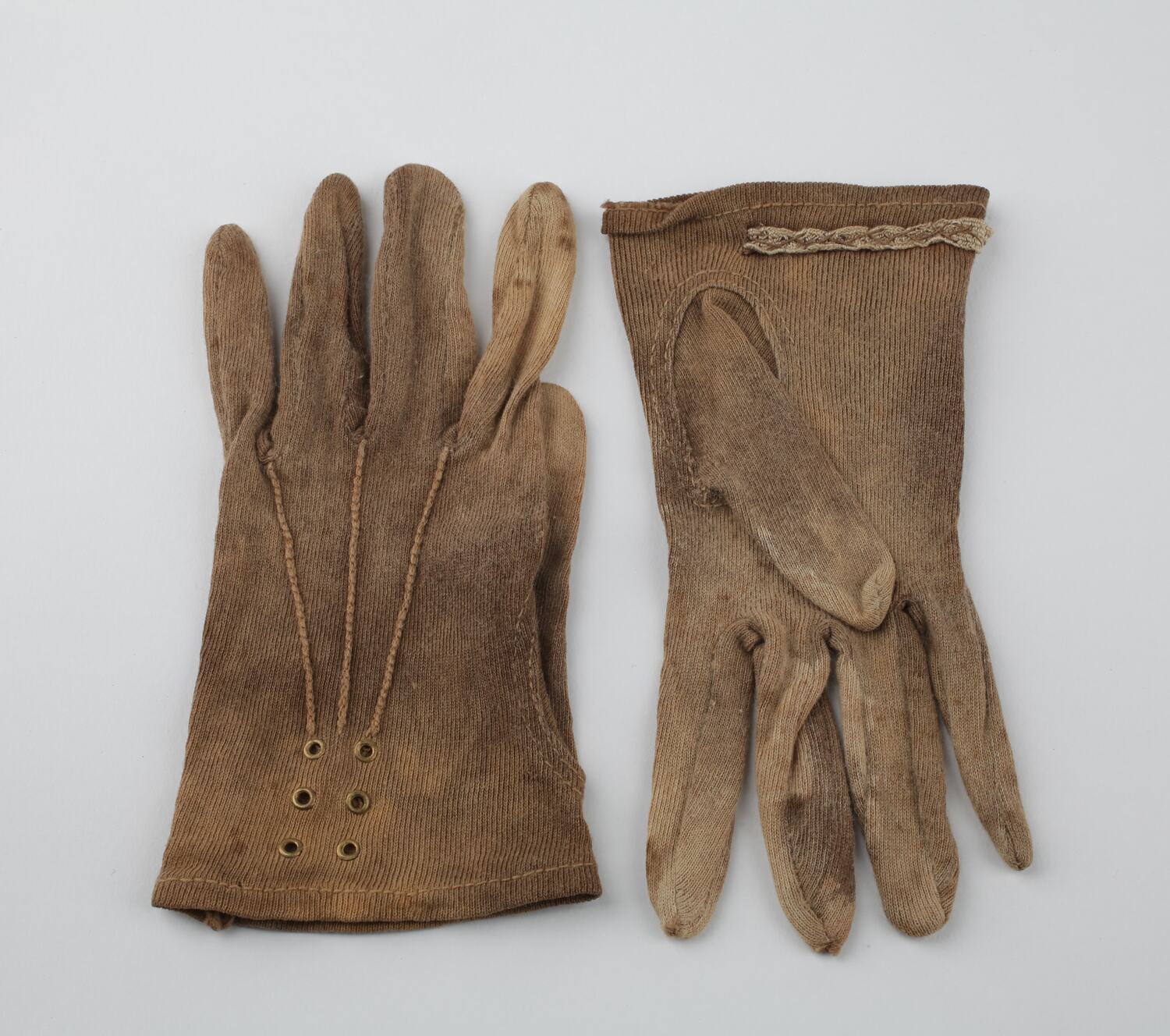 Children's beige cotton lisle gloves. Gloves have stitched welts on the back of the hand and six metal-edged eyes.