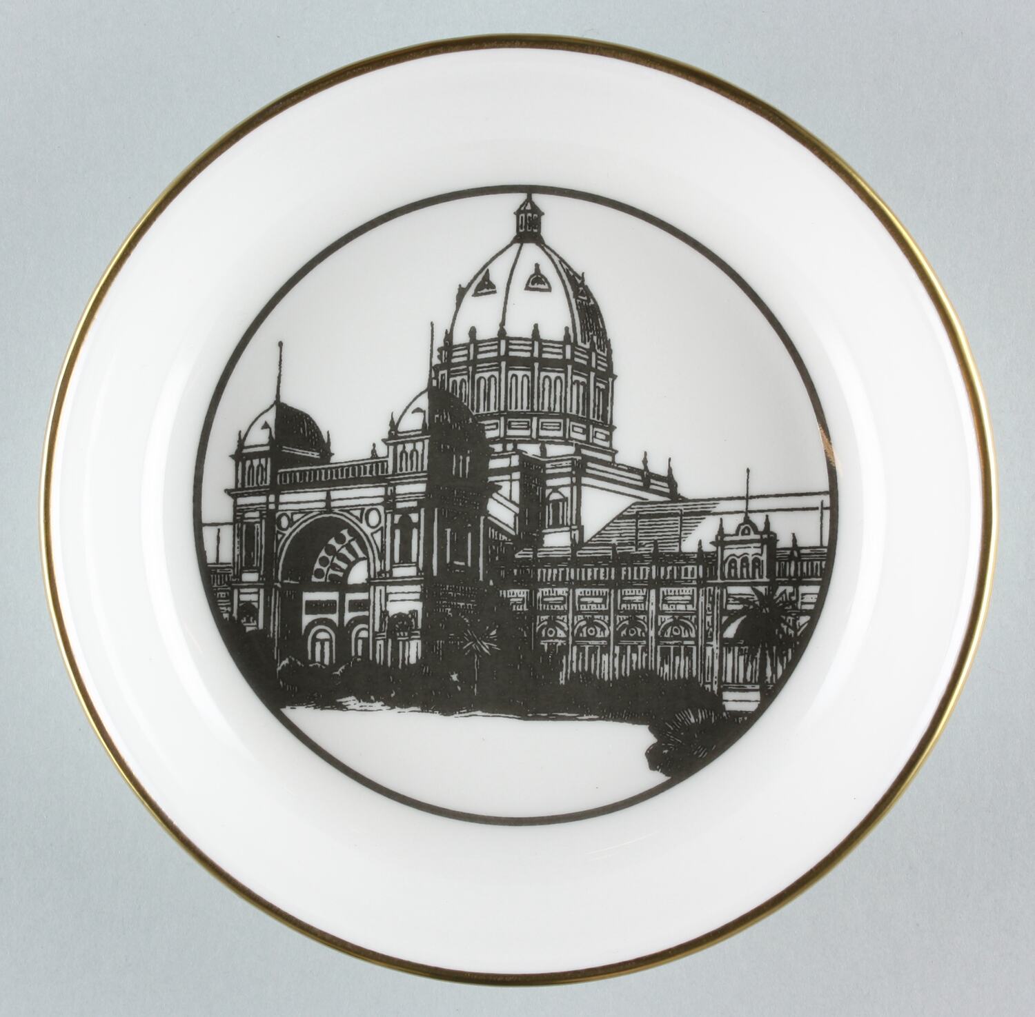 Small, shallow porcelain dish. White, transfer printed with a black & white image of the Royal Exhibition Building on the inside of the bowl. Gold rim. Still in its original plastic bag wrapper and presentation royal blue, cardboard box.
