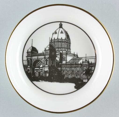Porcelain dish, manufactured by Royal Worcester in England, released to celebrate Tupperware's 40th Anniversary in Australia which occurred in April 2001. An image of the Royal Exhibition Building in Melbourne was chosen to represent the iconic brand, famous for selling its wares by direct marketing at Tupperware Parties.