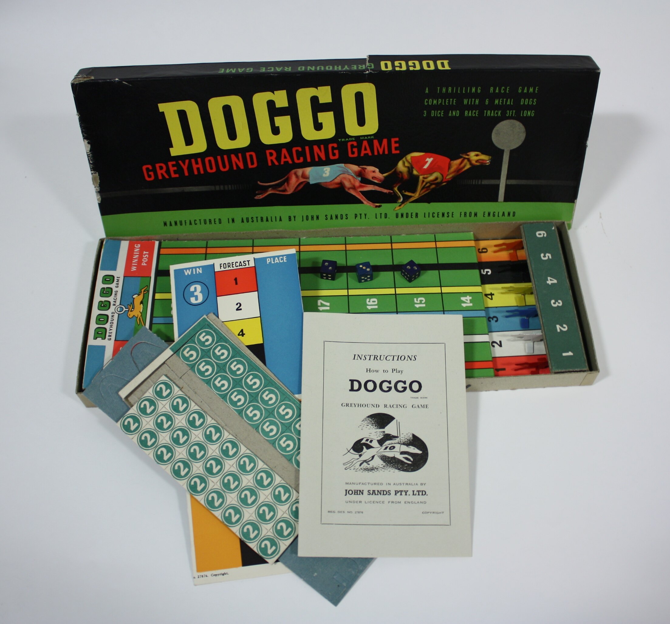 Box cover in full cover has the following inscriptions Top: 'DOGGO/TRADE MARK/GREYHOUND RACING GAME/A THRILLING RACE GAME/COMPLETE WITH 6 METAL DOGS/3 DICE AND RACE TRACK 3 FT. LONG/MANUFACTURED IN AUSTRALIA BY JOHN SANDS PTY. LTD. UNDER LICENSE FROM ENGLAND' Long sides: 'DOGGO GREYHOUND RACE GAME' Short Sides: 'DOGGO'