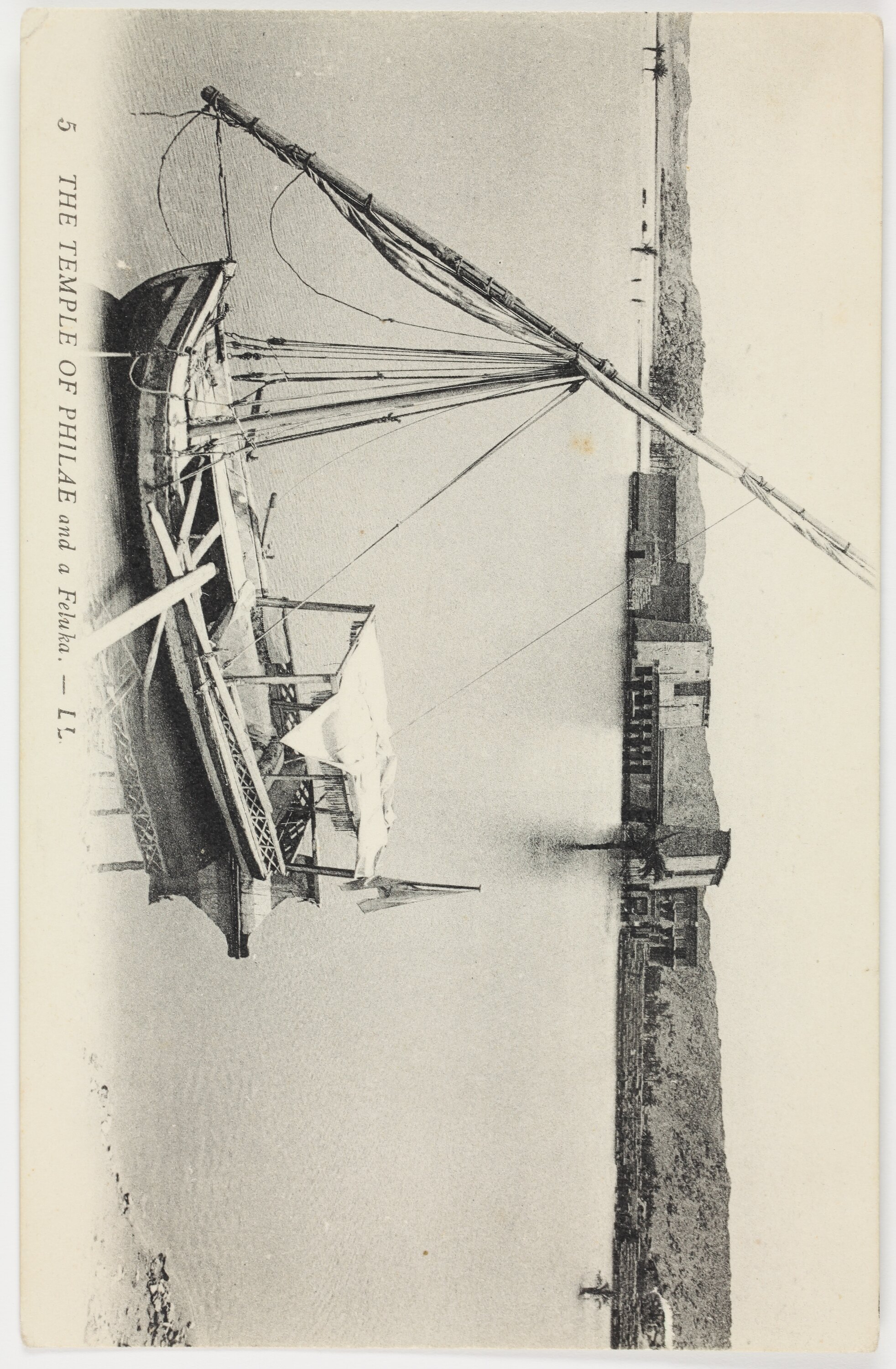 Printed in red ink on the front of the postcard; '5 THE TEMPLE OF PHILAE and a Feluka. - LL' Printed in black ink on the back of the postcard; 'Union Postale Universelle / Post Card. - Carte Postale. - Postkarte. - Briefkaart. / Cartolina Postale. - Tarjeta Postal / 5 Le Temple de Philae et une Felouque, - LL'