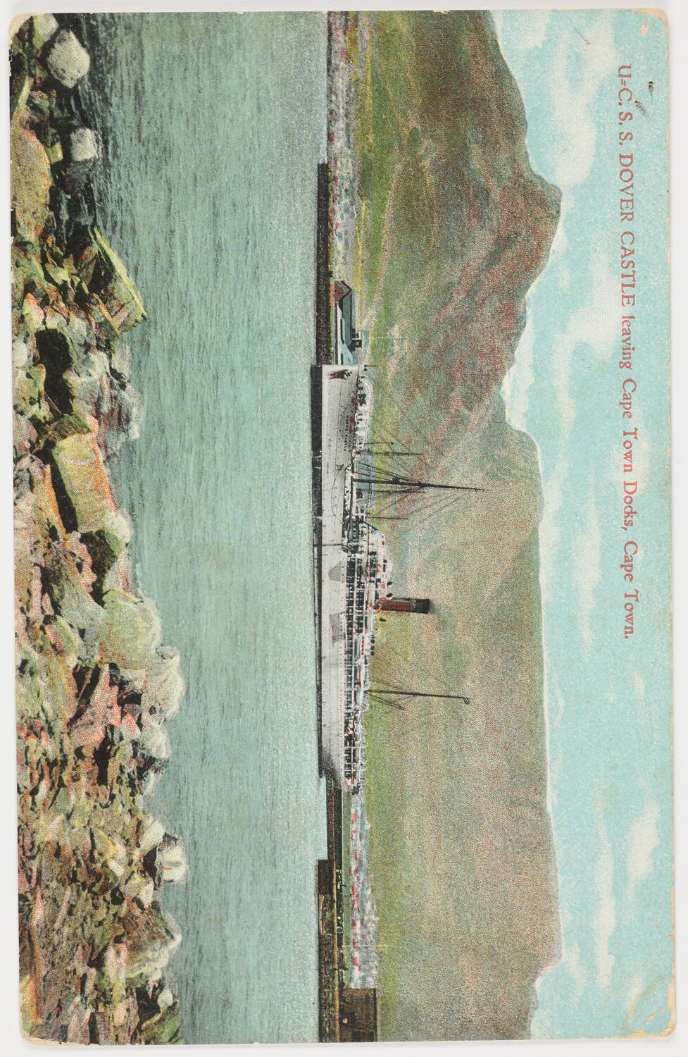 Printed in red ink on the front of the postcard; 'U=C. S.S. DOVER CASTLE leaving Cape Town Docks, Cape Town.' Printed in black ink on the back of the postcard; 'POST CARD / The Address only here / STAMP / No. 1021. Published by H. VERNON. 74, Plein Street, Cape Town. Printed in Germany'