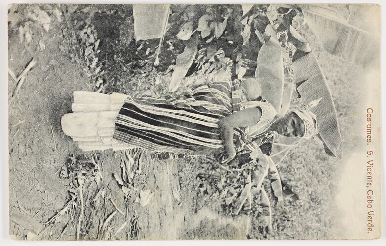 Printed in brown ink on the front of the postcard; 'Costumes. S. Vicente, Cabo Verde.' Printed in brown ink on the back of the postcard; 'Union Postale Universelle. / Bilhete Postale - Carte Postale. / No. 6 / Joco Joaquim Ferreirs, London-House, Cape Verdes'