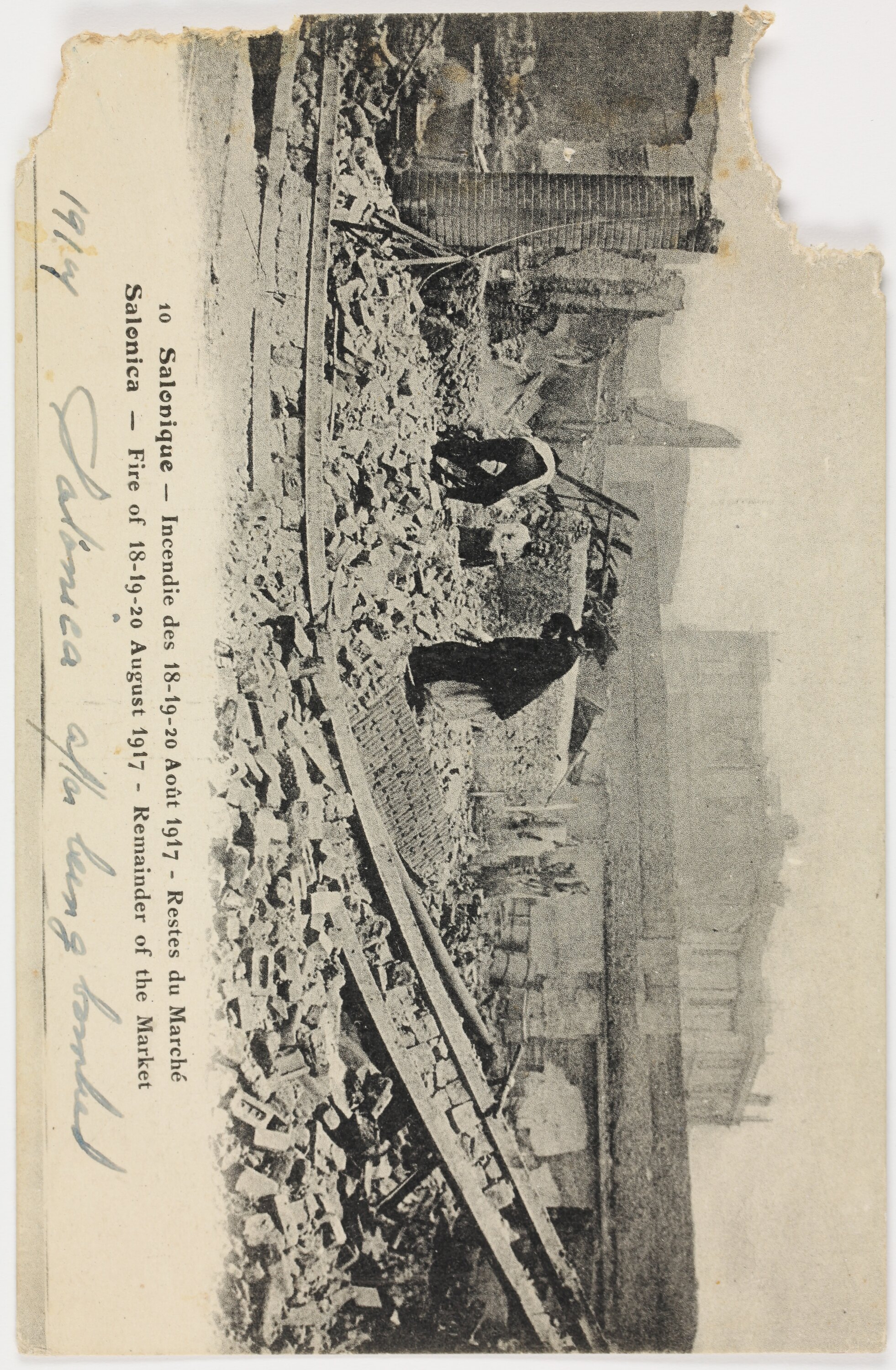 Printed in black ink on the front of the postcard; '10 Salonique - Incendie des 18-19-20 Aout 1917 - Restes du Marche / Salonica - Fire of 18-19-20 August 1917 - Remainder of the Market' Hand written in black ink on the front of the postcard; '1917 Salonica after being bombed' Printed in black ink on the back of the postcard; 'CARTE POSTALE / Correspondence / Adresse / Edition Parisiana, Paris / [illeg] PHOT. DES ESTABLISSEMENTS[?] CH. COLLAS & CIE COGNAC'