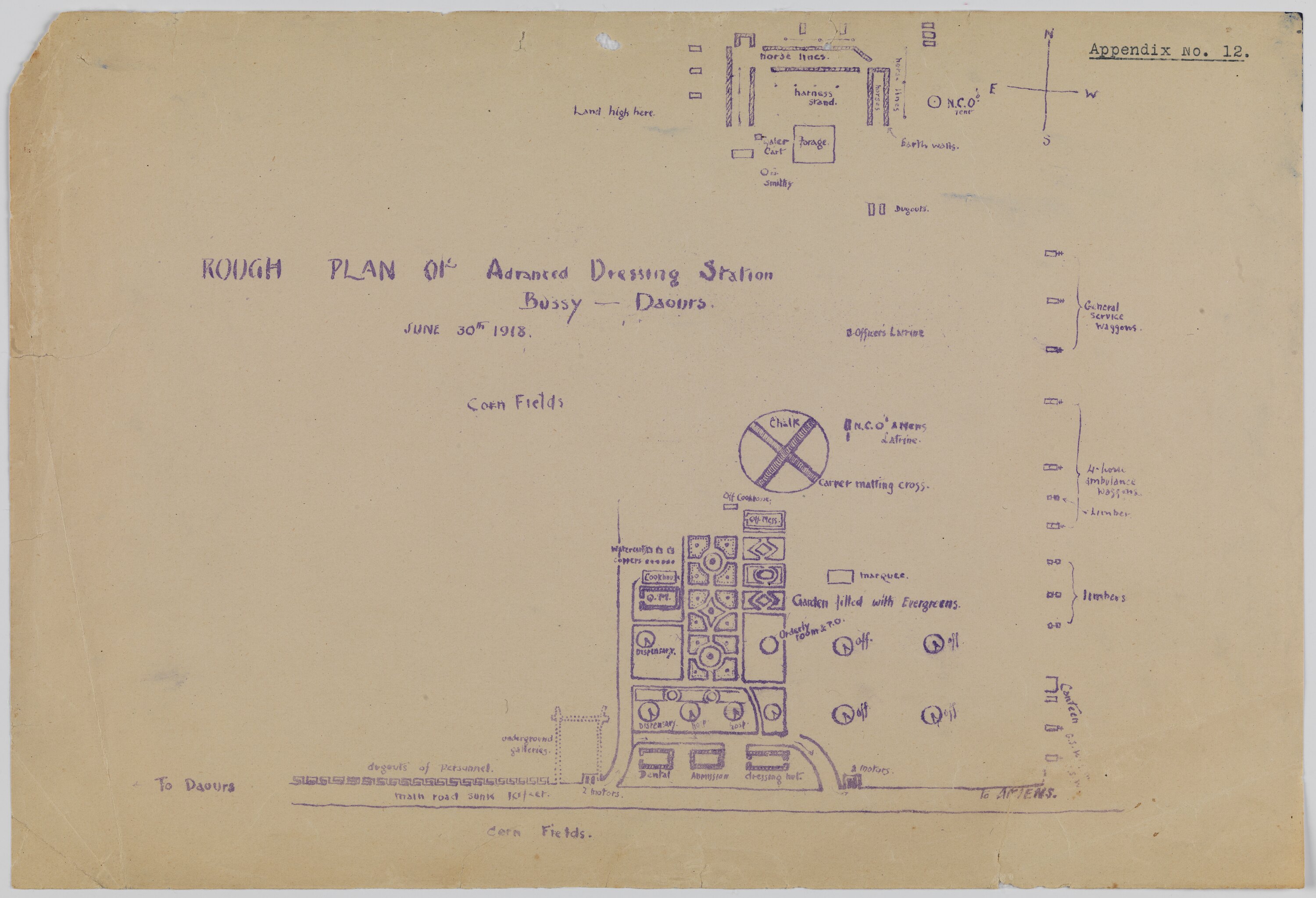Printed front: "Appendix No. 12 / ROUGH PLAN of Advanced Dressing Station / Bussy - Daonrs(?) / June 30 1918