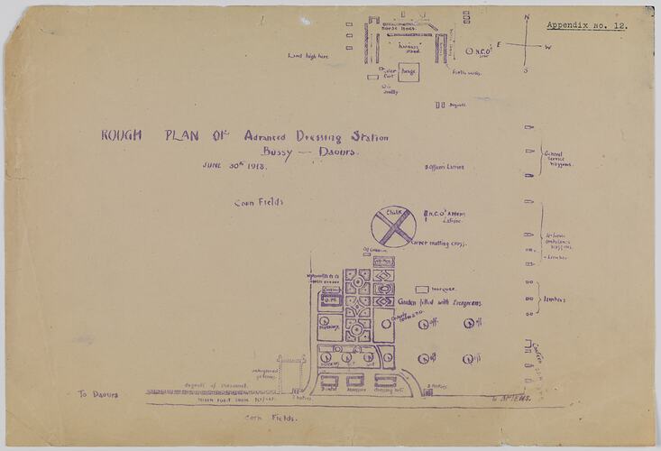 Rough plan of the advanced dressing station,13th Australian Field Ambulance, 'Bussy - Daonrs(?)' - likely Bussey-Daours, aka Bussy-lès-Daonrs or Bussy les Daours, in Somme, Picardie, France. The plan is dated 30 June 1918.