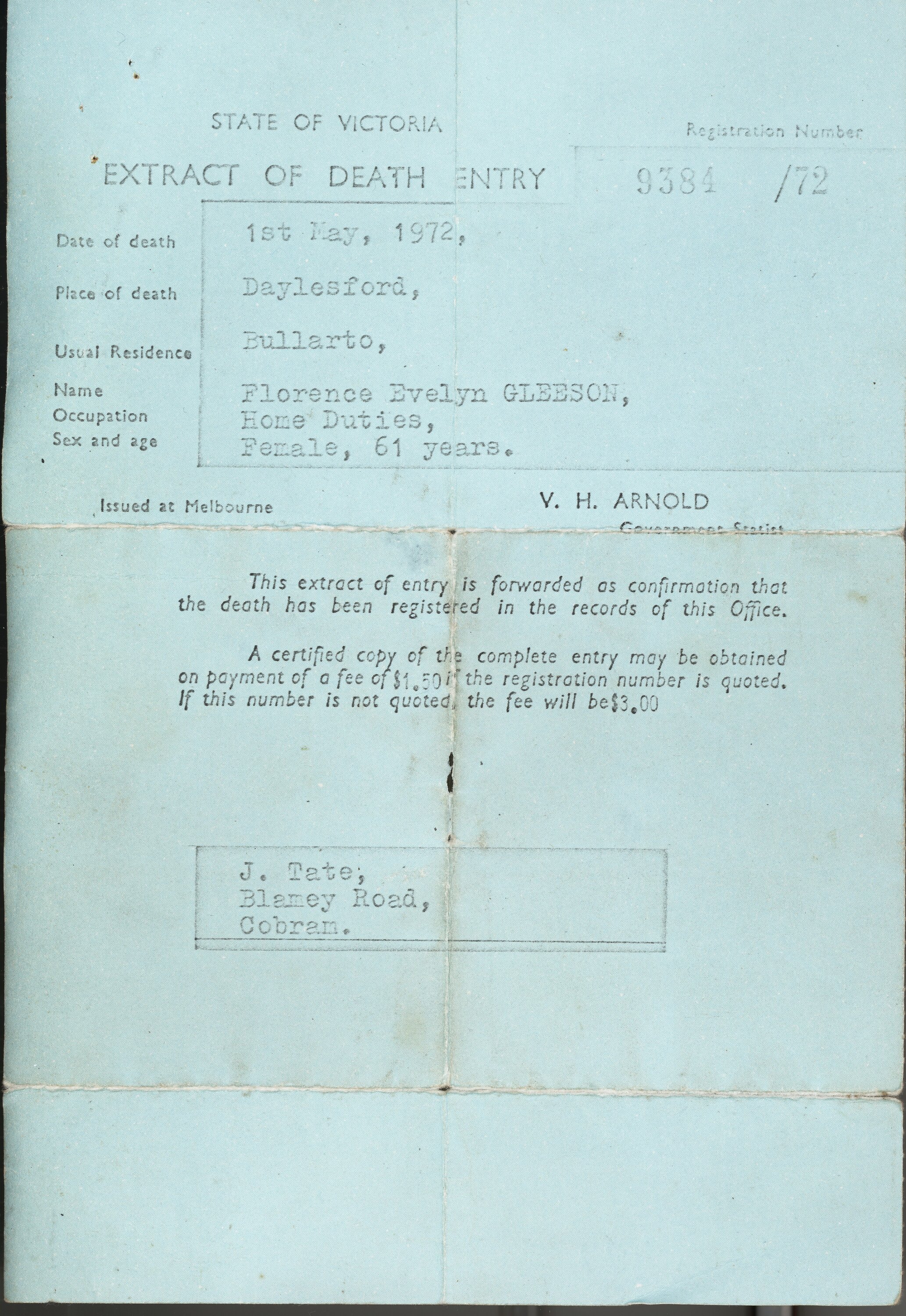 Printed with typewritten entries: "STATE OF VICTORIA / EXTRACT OF DEATH ENTRY / Registration Number 9384 / 72 / Date of Death: 1st May, 1972 / Place of Death: Daylesford, / Usual Residence: Bullarto, / Name: Florence Evelyn GLEESON / Occupation: Home Duties, / Sex amd age: Female, 61 years. / Issued at Melbourne / V.H. ARNOLD / Government Statist'. And futher text.