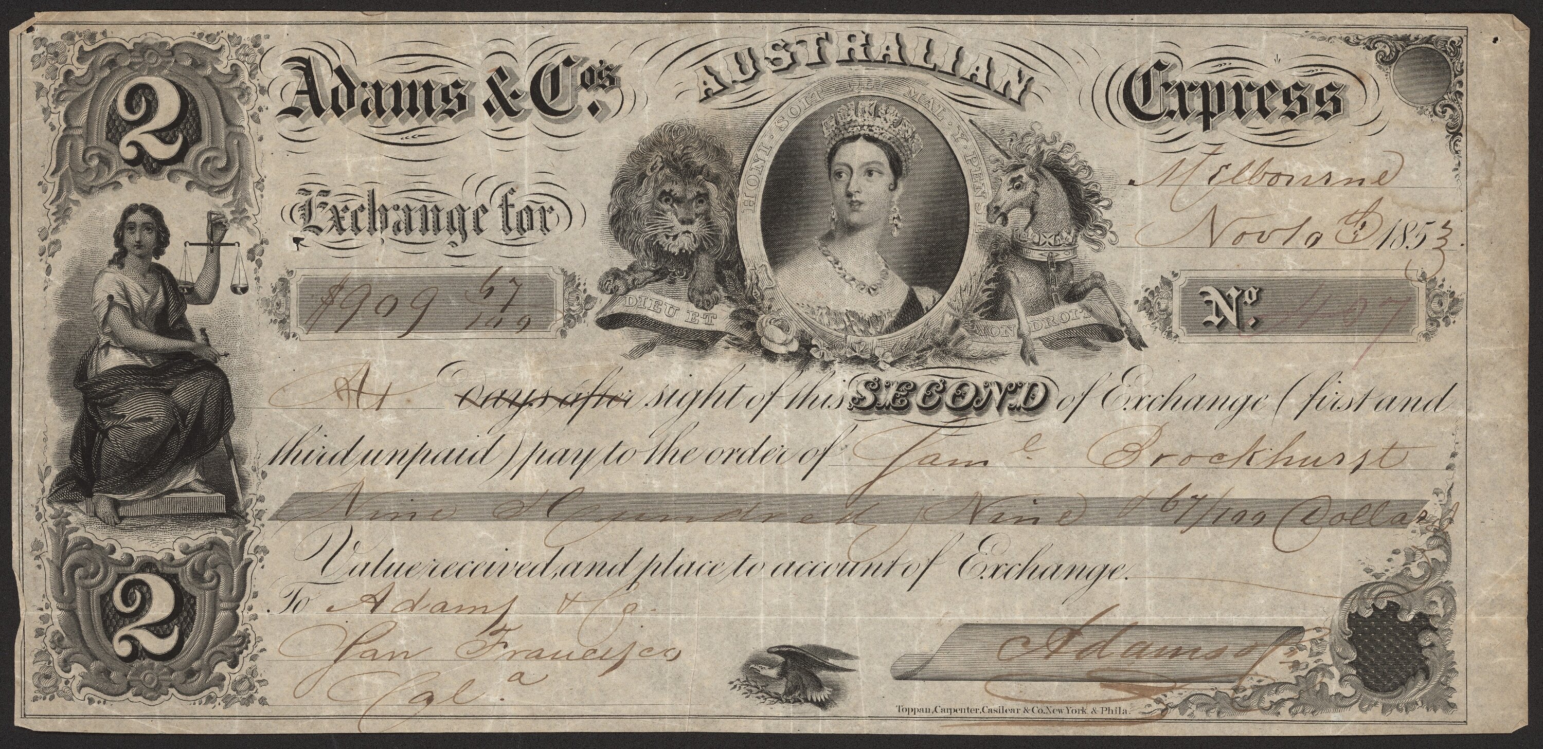 Text in <> brackets handwritten, the rest is printed in black ink. '2 Adams & Co.'s Australian Express <Melbourne / Nov 10th 1853.> / Exchange for / $909 67/100 No.407 / At sight of this SECOND of Exchange (first and / third unpaid) pay to the order of <Sam' l (?) Brockhurst> / <Nine Hundred & Nine & 67/100 Dollars> / Value received and place to the account of Exchange. / To <Adams & Co. / San Francisco / Cal.a> 2 <(signed)Adams of > / Toppan, Carpenter, Casilear & Co., New York & Phila.' Printed around coat of arms 'DIEU ET / HONI - SOIT - QUI - MAL - Y - PENSE / MONDROIT' - An old French phrase meaning: "Shamed be he who thinks evil of it".