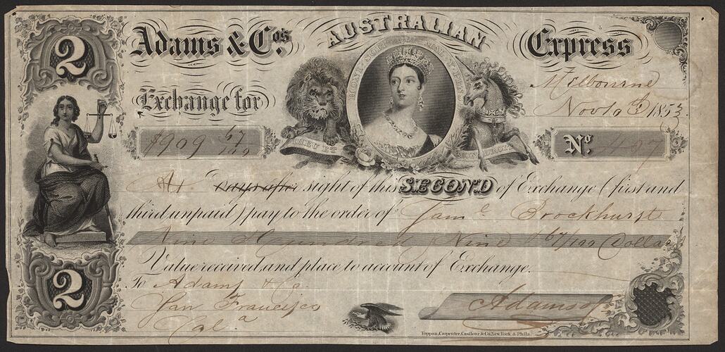Second Bill of Exchange (No.407) issued by Adams & Co.'s Australian Express, Melbourne, 10th Nov 1853, to Adams & Co., San Francisco, California, for payment of US$ 909 & 67 cents to the order of Samuel Brockhurst. The blank bill was printed by Toppan, Carpenter, Casilear & Co., of New York & Philadelphia, a firm who specialised in the engraving and printing of paper securities such as private bank notes and postage stamps.