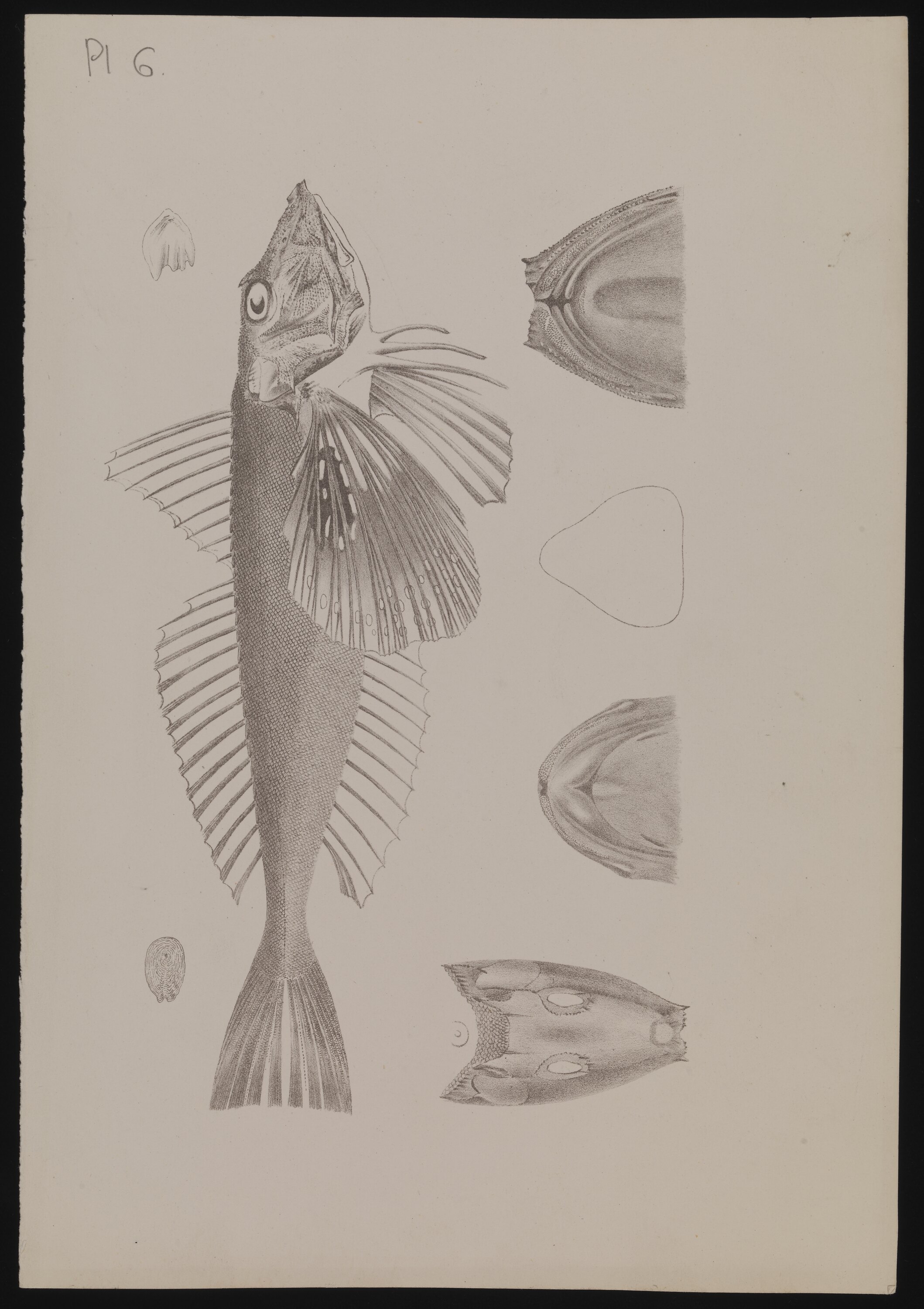 Single colour proof (black) of a Red Gurnard, Chelidonichthys kumu, by Arthur Bartholomew as both artist and lithographer. This work was commissioned by Frederick McCoy, the first Director of The National Museum of Victoria, for Plate 6 in 'The Prodromus of the Zoology of Victoria; Figures and descriptions of the living species of all classes of the Victoria indigenous animals'. The illustration was based on a specimen collected in Hobsons Bay, Port Phillip, in August 1864, referred to by McCoy as Trigla kumu, The Kumu Gurnard.