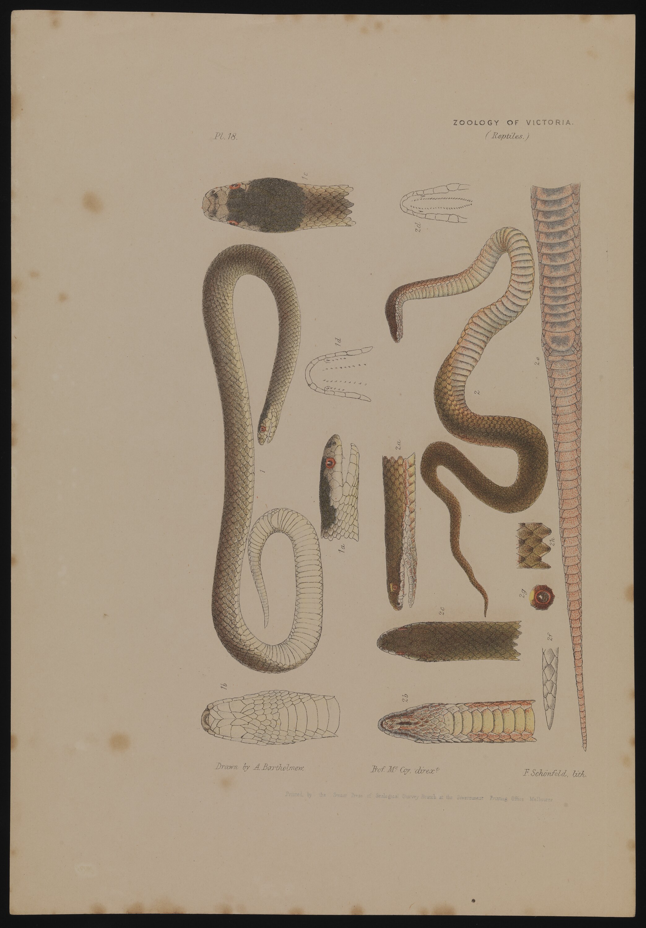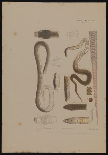 Lithographic colour proof of a White-lipped Snake, Drysdalia coronoides, and a Little Whip Snake, Suta flagellum, published as Plate 11 in The Prodromus of the Zoology of Victoria by Frederick McCoy. This work is labelled as "Plate 18".