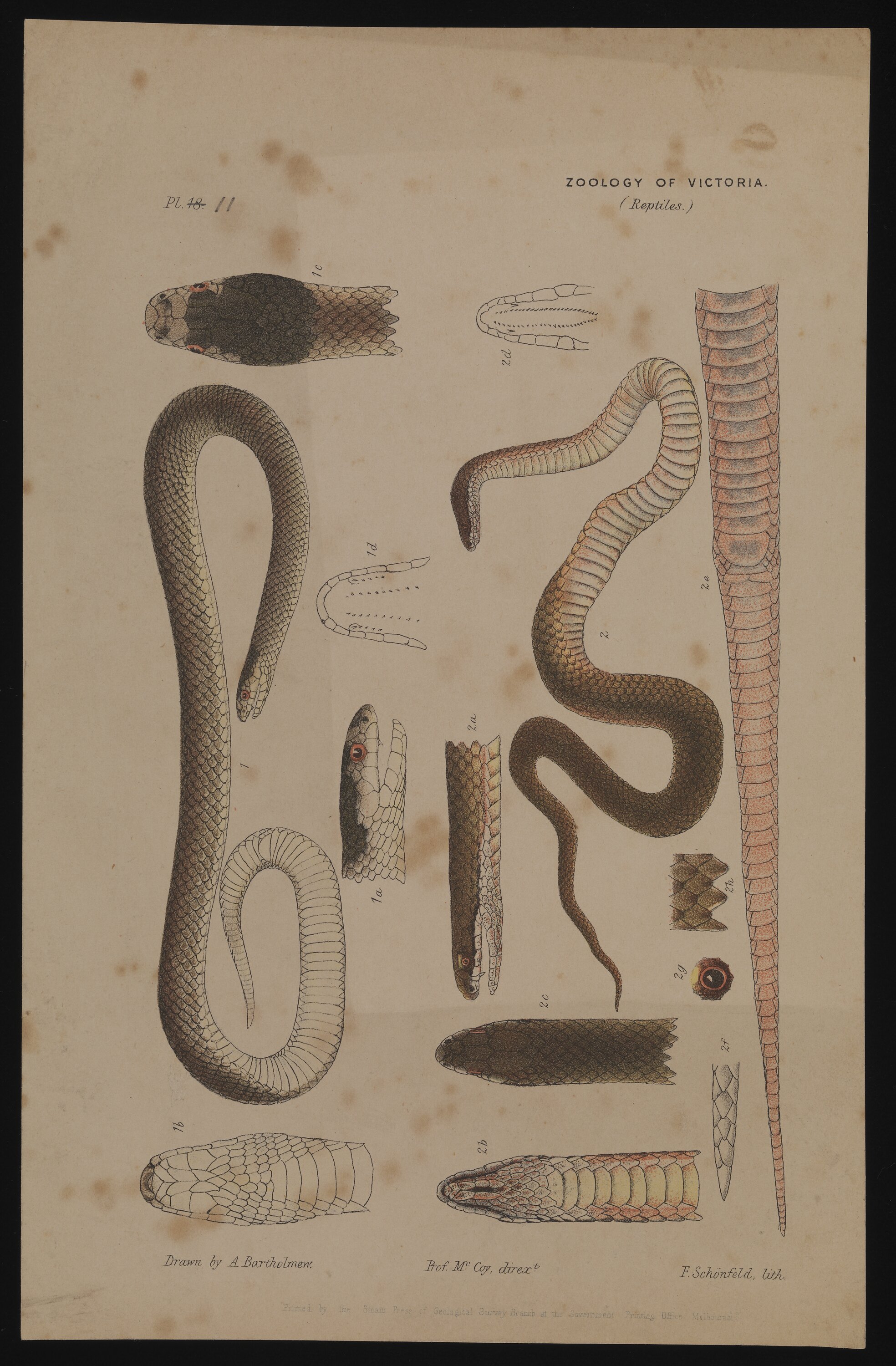 Lithographic colour proof of a White-lipped Snake, Drysdalia coronoides, and a Little Whip Snake, Suta flagellum, published as Plate 11 in The Prodromus of the Zoology of Victoria by Frederick McCoy.