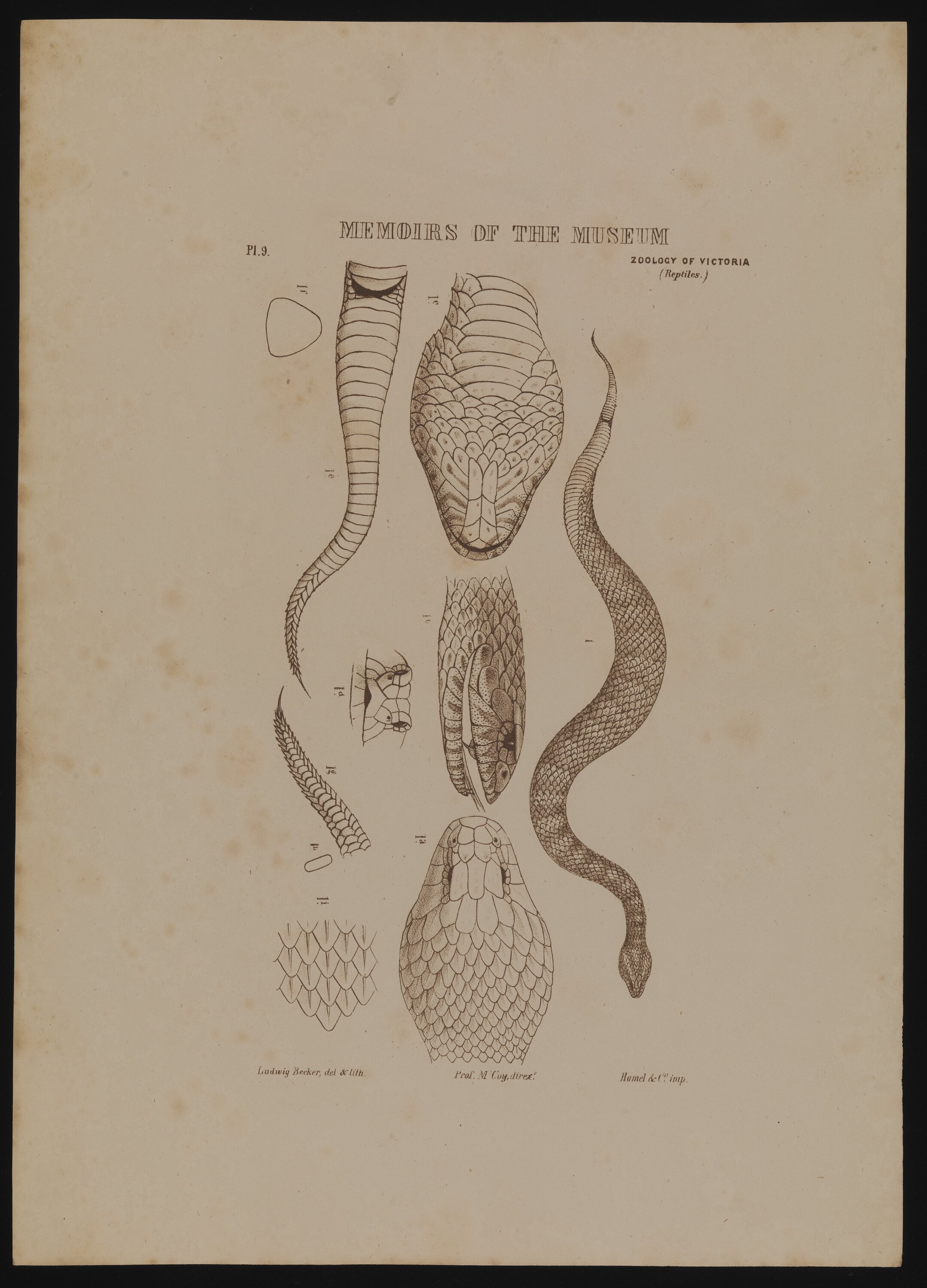 Lithographic single colour proof of a Death Adder, Acanthophis antarcticus, form near the Murray River, by Ludwig Becker for published Plate 12 of the Prodromus of the Zoology of Victoria by Frederick McCoy.
