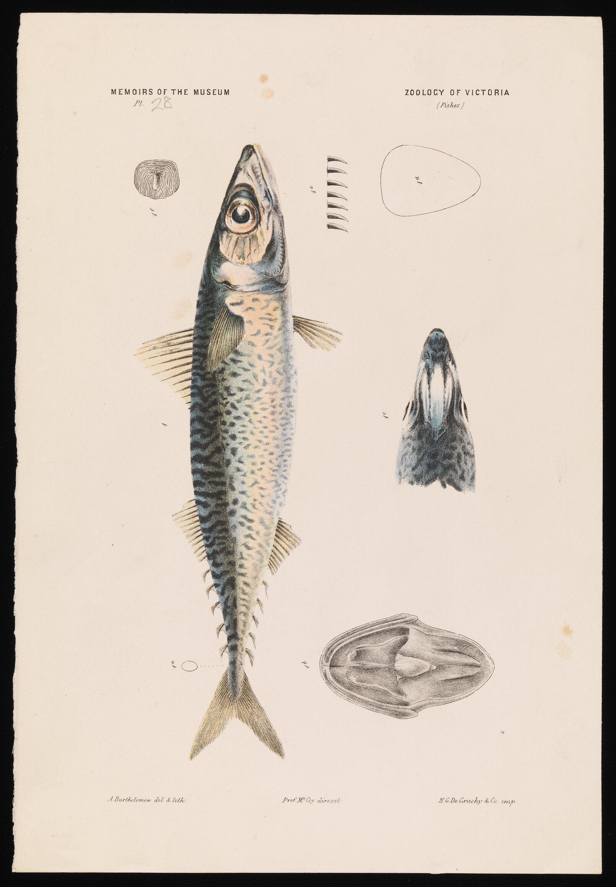 Blue Mackerel, Scomber australasicus Cuvier, in Cuvier & Valenciennes, by Arthur Bartholomew (del & lith). Lithographic proof D - lithographic ink and pencil on paper, 19cm x 28cm . Published as plate 28 in The Prodromus of the Zoology of Victoria by Frederick McCoy.