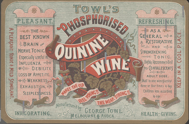 Colourful label for quinine wine manufactured by George Towl in Melbourne and Avoca. The label exhalts the effectiveness of the product. The wine is described as being 'a pleasant tonic and mild stimulant', particularly useful for treating influenza, debility, loss of appetite, weakness, exhaustion and sleeplessness. It is also hailed as making 'the old feel young, the weak strong!' Quinine wine was commonly used as a treatment against malaria in Europe until the 1940s when it was replaced by advanced medicine.