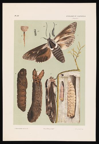 Full colour proof of the caterpillar, pupa, adult Wattle Goat Moth, Endoxyla encalypti, and host plant, from Studley Park, Melbourne, by Arthur Bartholomew. This work was finally published as Plate 30 in The Prodromus of the Zoology of Victoria by Frederick McCoy.