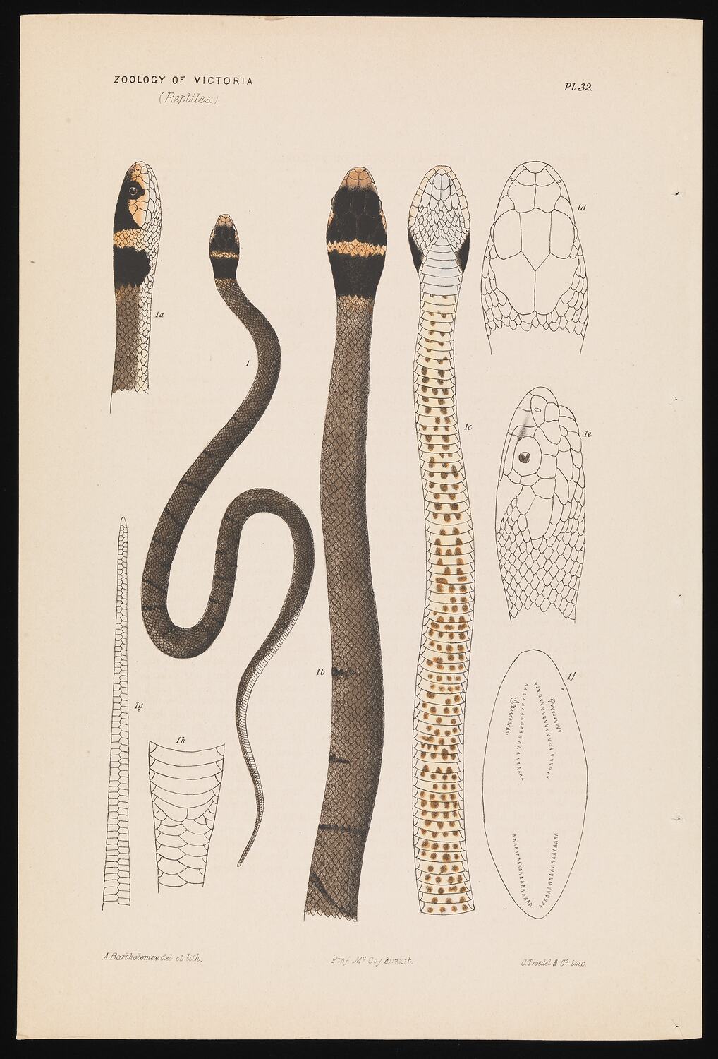 Colour plate of a juvenile Eastern Brown Snake, Pseudechis textilis, from Longwood, Victoria, by Arthur Bartholomew, 8 July 1879. This work was commissioned by Frederick McCoy, the first Director of The National Museum of Victoria, for Plate 32 in The Prodromus of the Zoology of Victoria; Figures and descriptions of the living species of all classes of the Victoria indigenous animals.